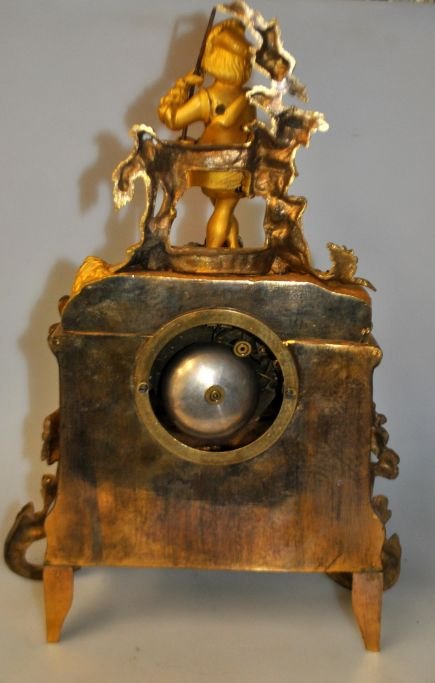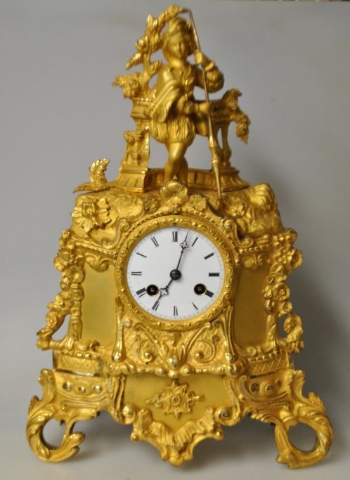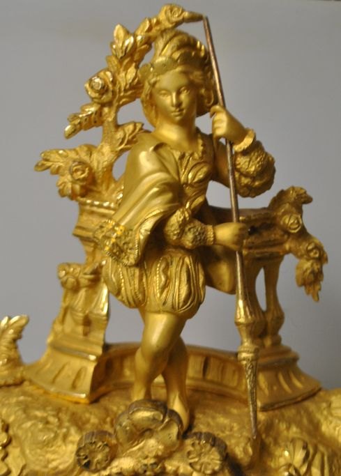 Fransk lueforgyldt kaminur, 1800-tallets begyndelse. Urkasse med dekorationer. Topfigur i form af stående soldat med spyd. Emaljeurskive med romertal. H.: 35 cm. B.: 25 cm. D: 7 cm.Med pendul og nøgle. Urværk med snorophæng Japy Freres.