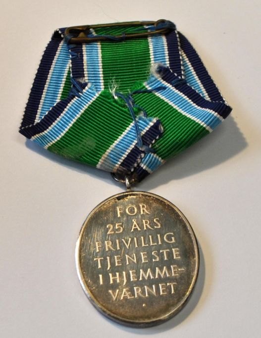 Fortjenstmedalje i sølv, 25 år i hjemmeværnet. Danmark. Med ordensbånd. I tilhørende æske. 3,3 x 2,8 cm.Emne nummer: 28377