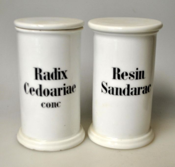 Par porcelæns apoteker krukker med låg, 19. årh. Royal Copenhagen, København, Danmark. Hvidt porcelæn med låg. Med sort tekst. Stemplet i låg. H.: 14 cm.Proveniens: Det nu nedlagte Svaneapotek i Randers.