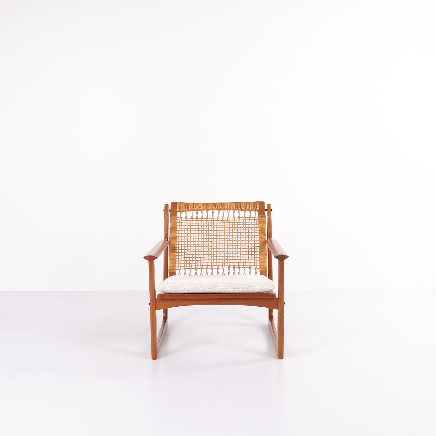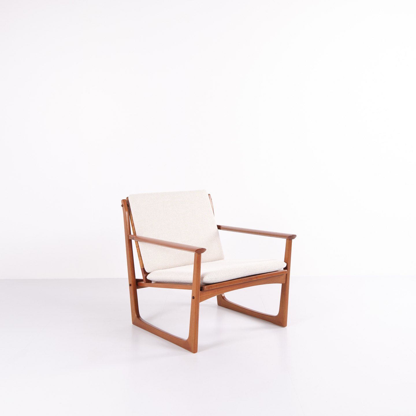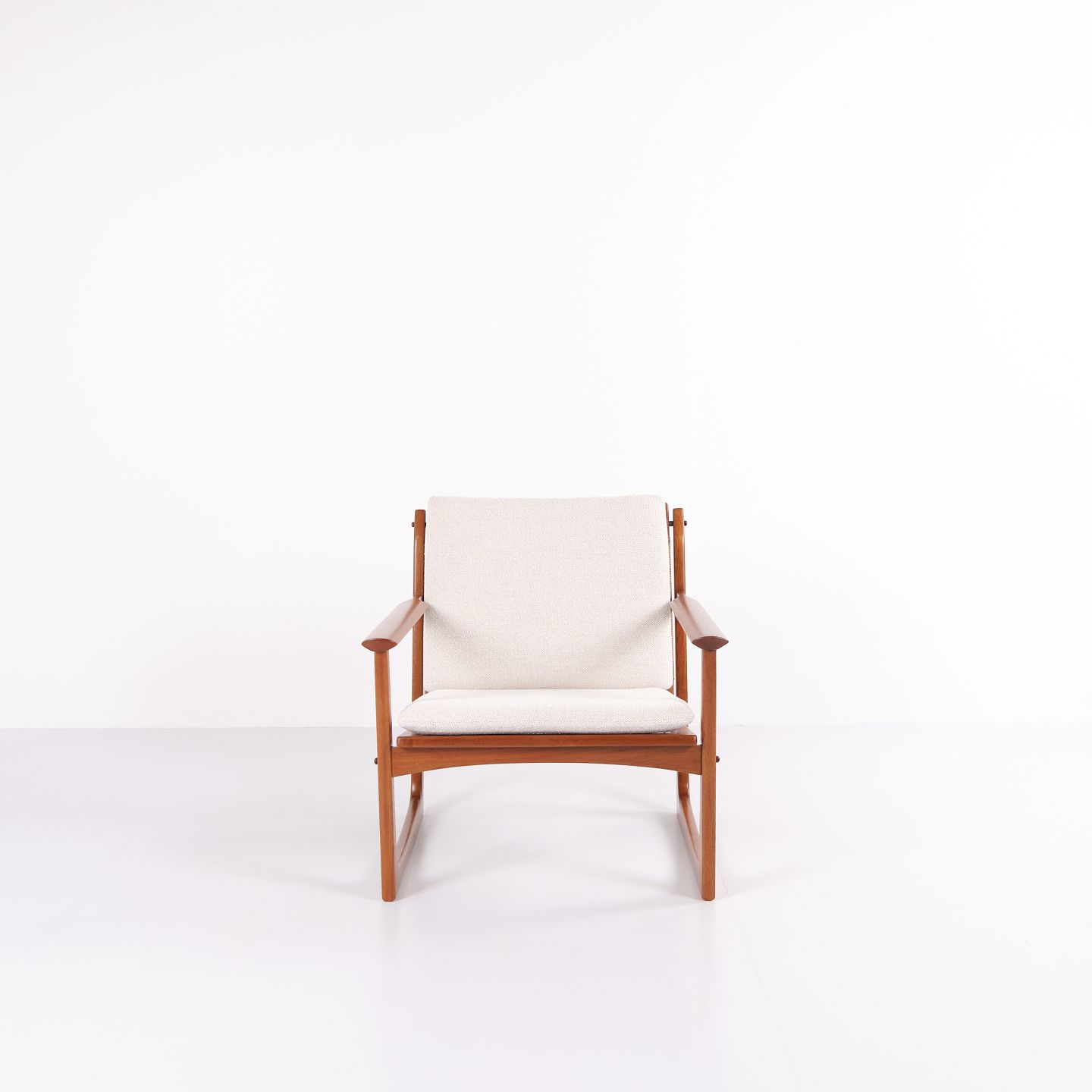 Lænestol designet af Hans Olsen og produceret af Selig i 1960’erne. Stolen er udført i massiv teaktræ med smukt formede armlæn og ben, betrukket med lyst stof, der fremhæver det varme træ og det harmoniske formsprog.— Oprindelse: Danmark