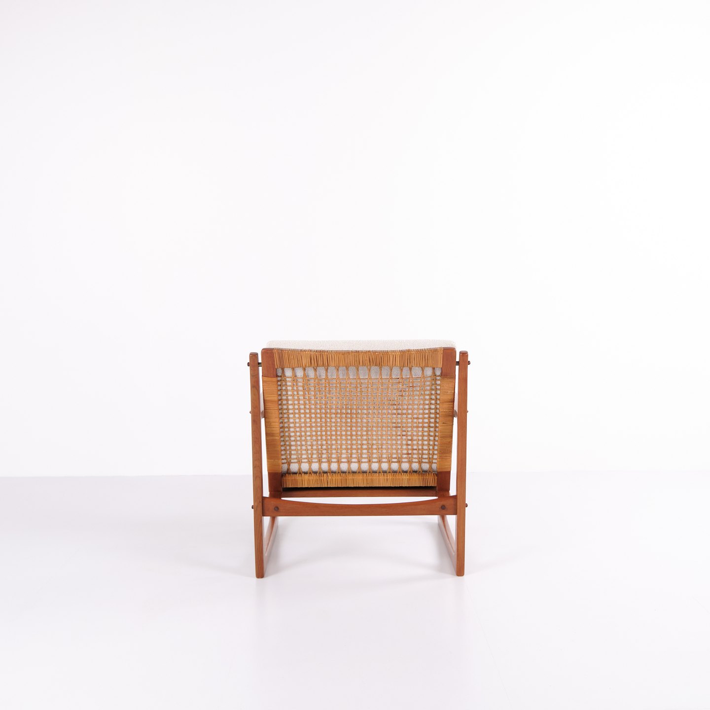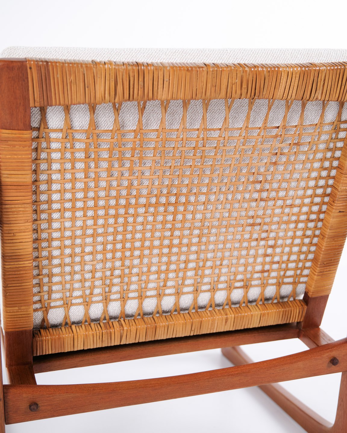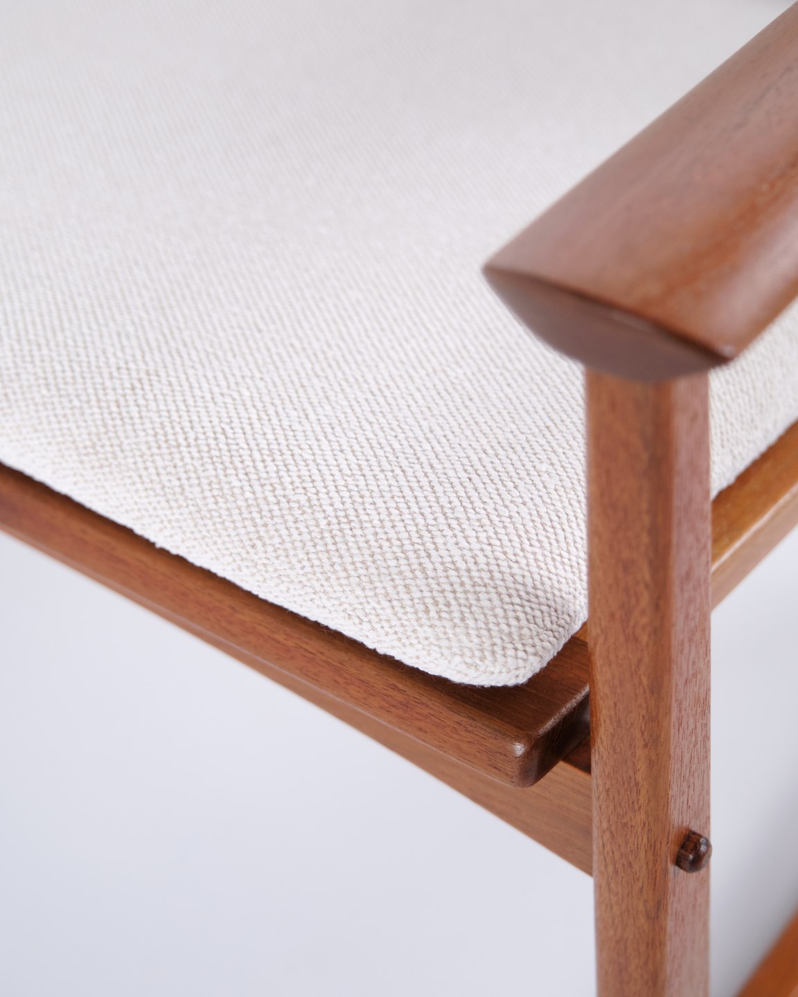 Lænestol designet af Hans Olsen og produceret af Selig i 1960’erne. Stolen er udført i massiv teaktræ med smukt formede armlæn og ben, betrukket med lyst stof, der fremhæver det varme træ og det harmoniske formsprog.— Oprindelse: Danmark