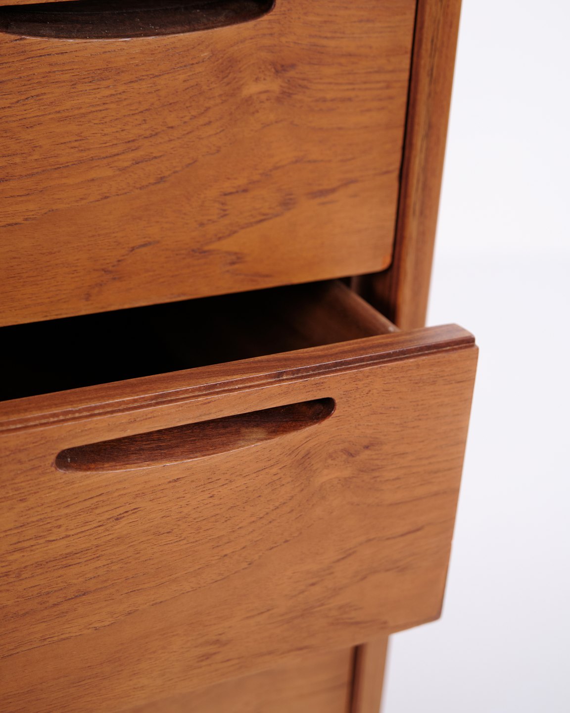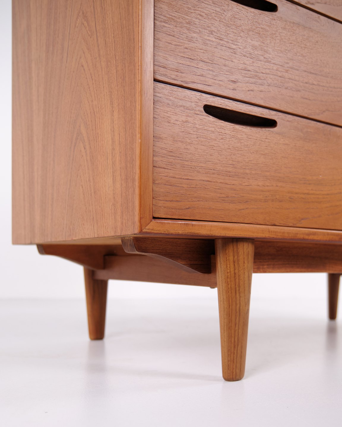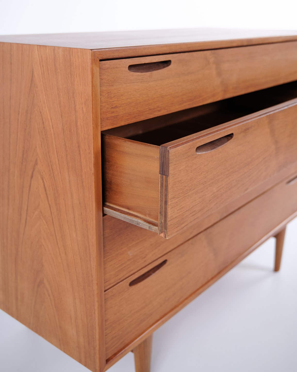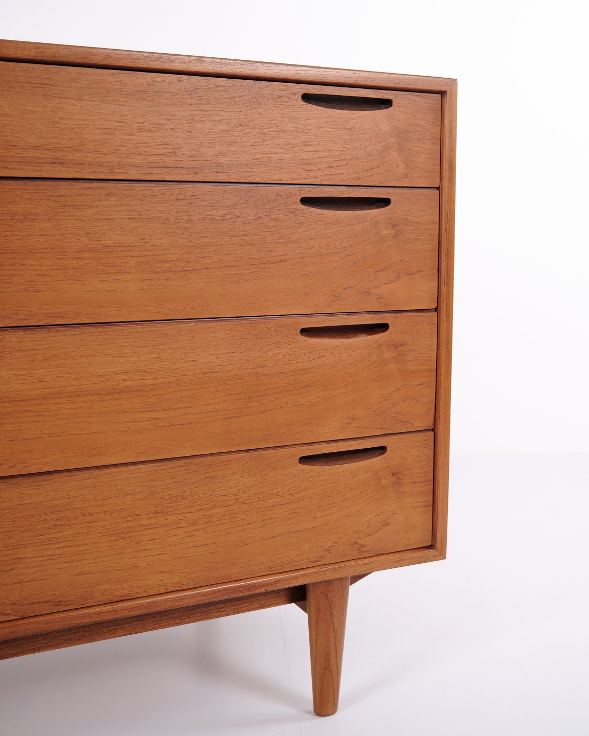 Kommode designet af Ib Kofod-Larsen og fremstillet af Brande Møbelfabrik i 1950’erne. Kommoden er udført i teaktræ med fire rummelige skuffer og karakteristiske, enkle greb, som understreger Kofod-Larsens rene og funktionelle formsprog.— Oprindelse: Danmark