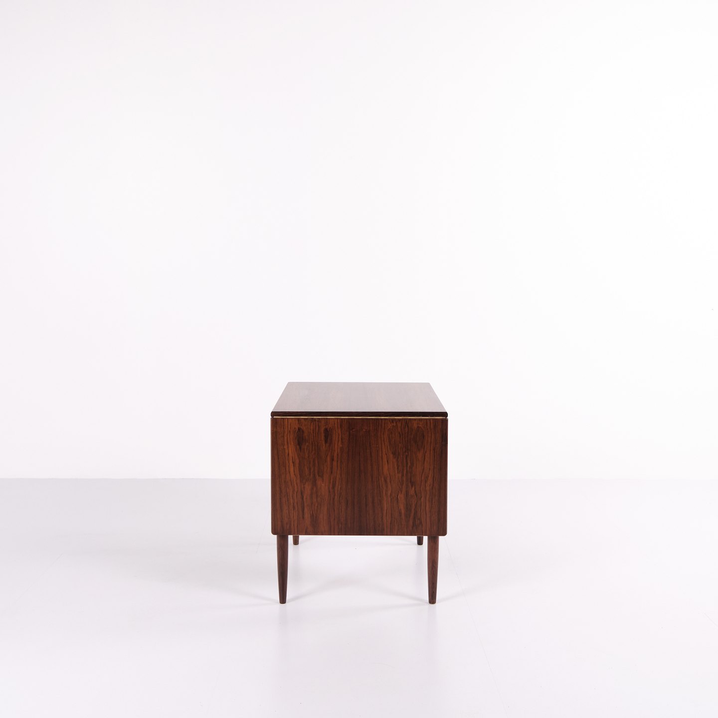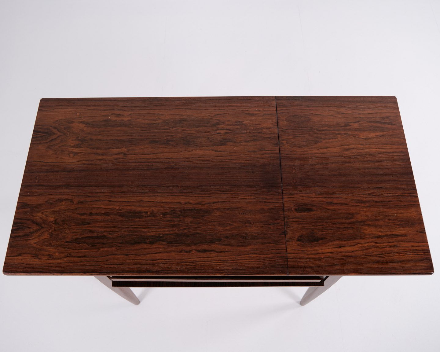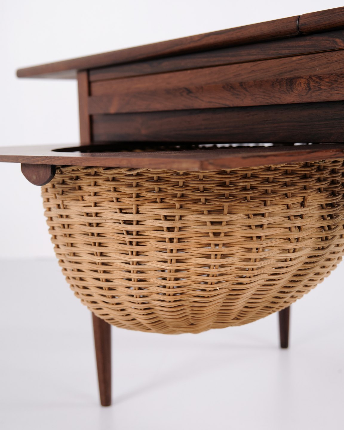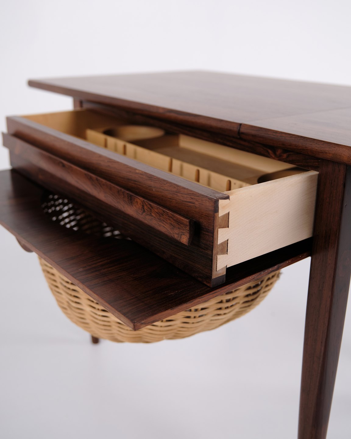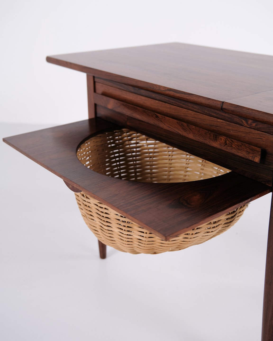 Foldbart sybord designet af Johannes Andersen og fremstillet af Silkeborg Møbelfabrik i 1960’erne. Bordet er udført i palisander og har både skuffe og udklappelig bordplade, hvilket gør det særligt funktionelt til opbevaring og arbejde.— Oprindelse: Danmark