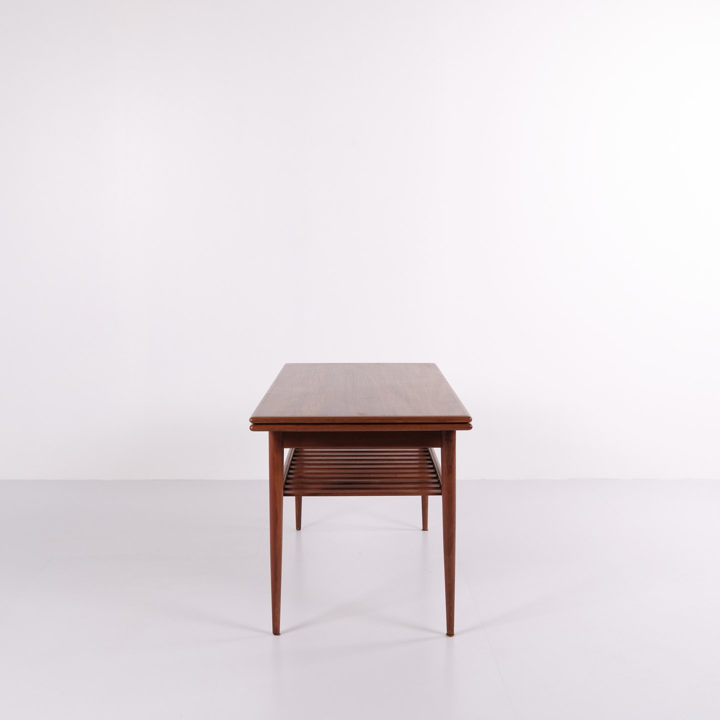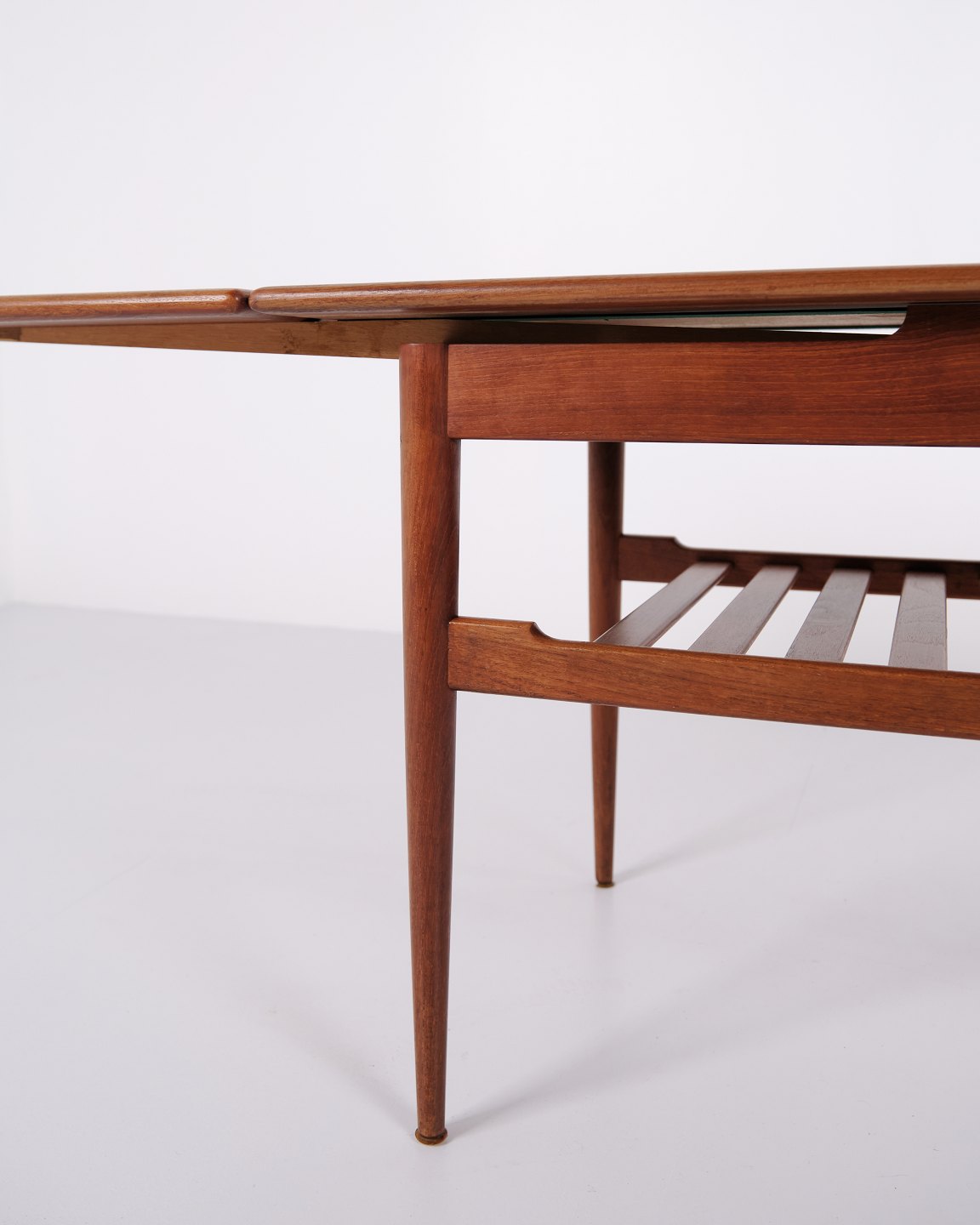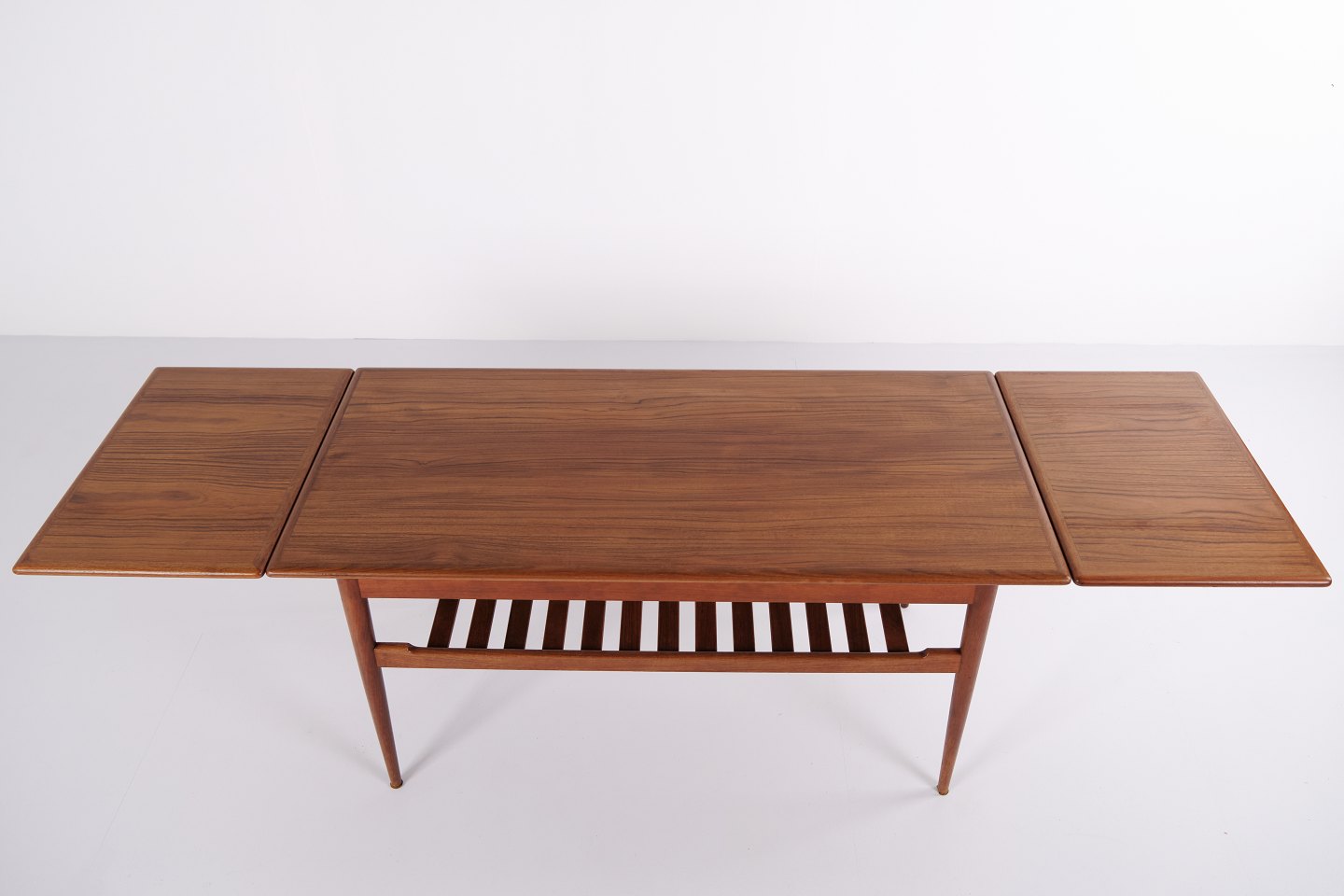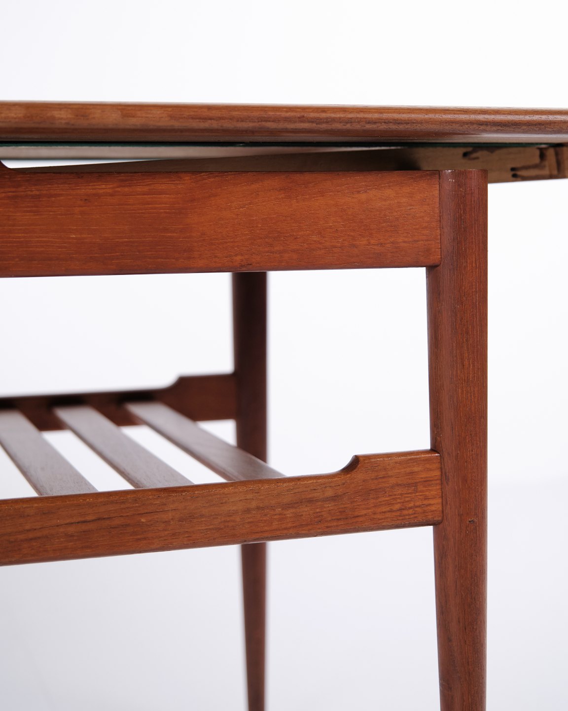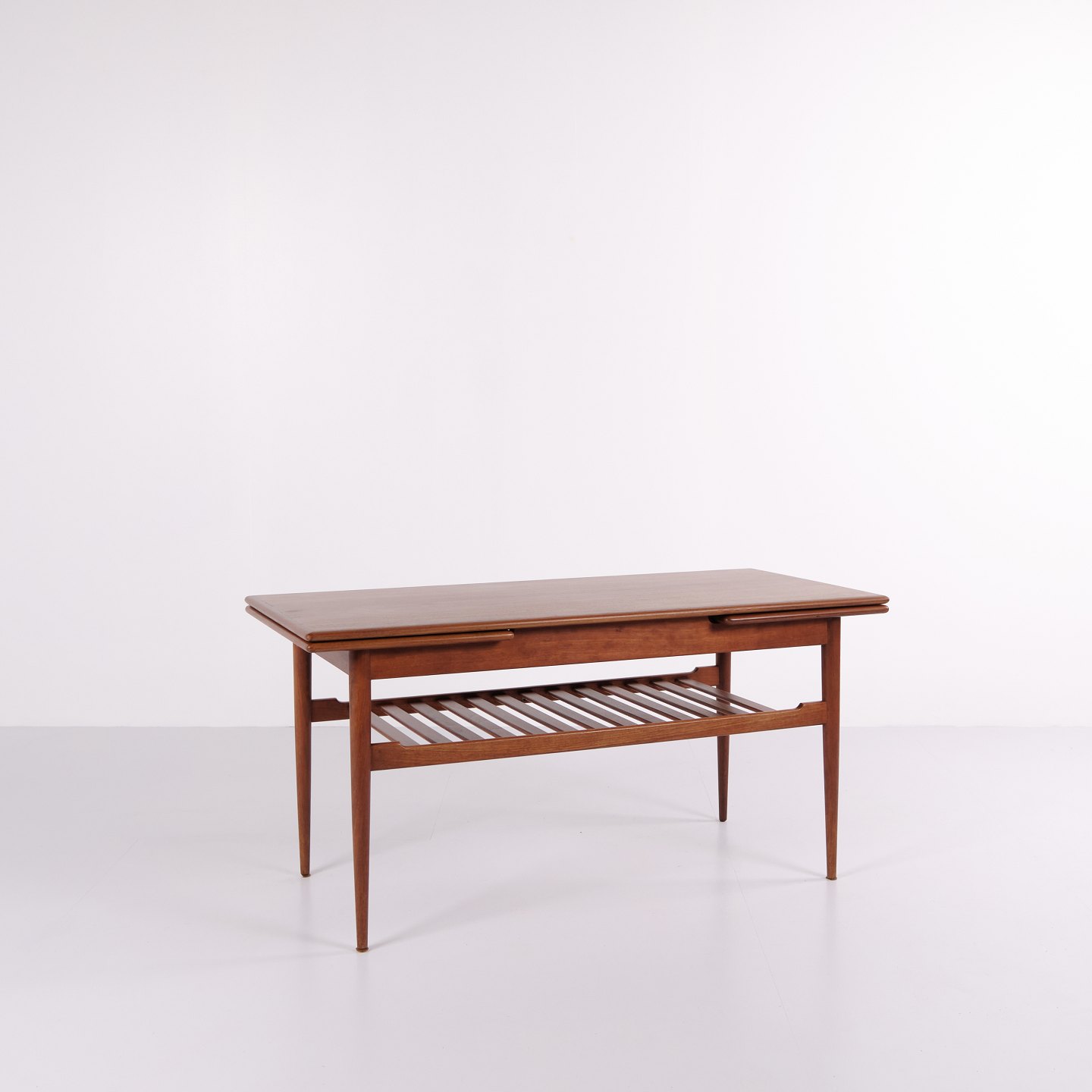 Sofabord fra 1960’erne, udført i teaktræ med praktisk hylde og udtræk, der giver ekstra bordplads efter behov.— Oprindelse: Danmark