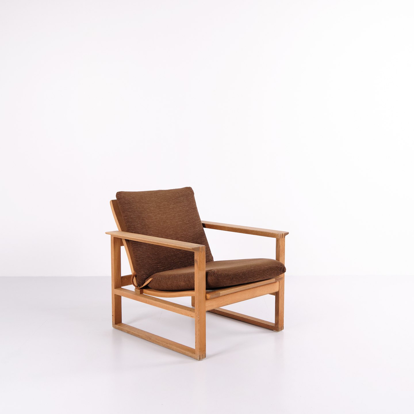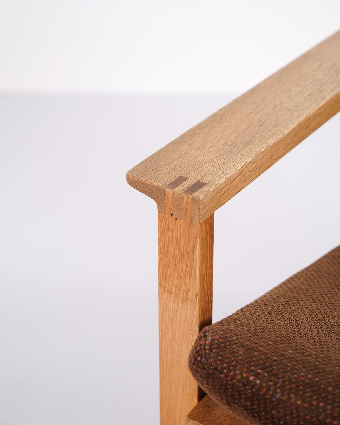 Børge Mogensen slædestol BM2256 fra Fredericia Stolefabrik. Egetræ med brune hynder.— Oprindelse: Danmark