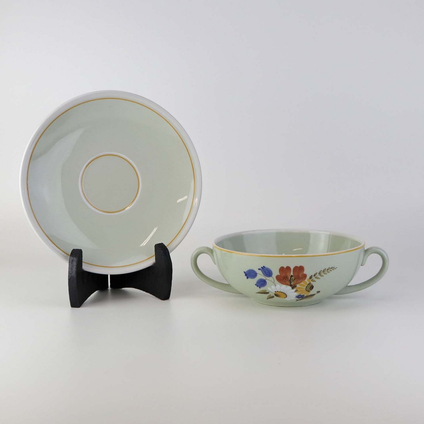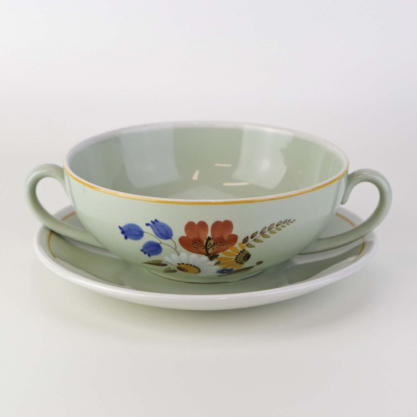 Suppekop med underkop i fajance fra stellet Frederiksberg. Nr. 265Formgiver Nils Thorsson