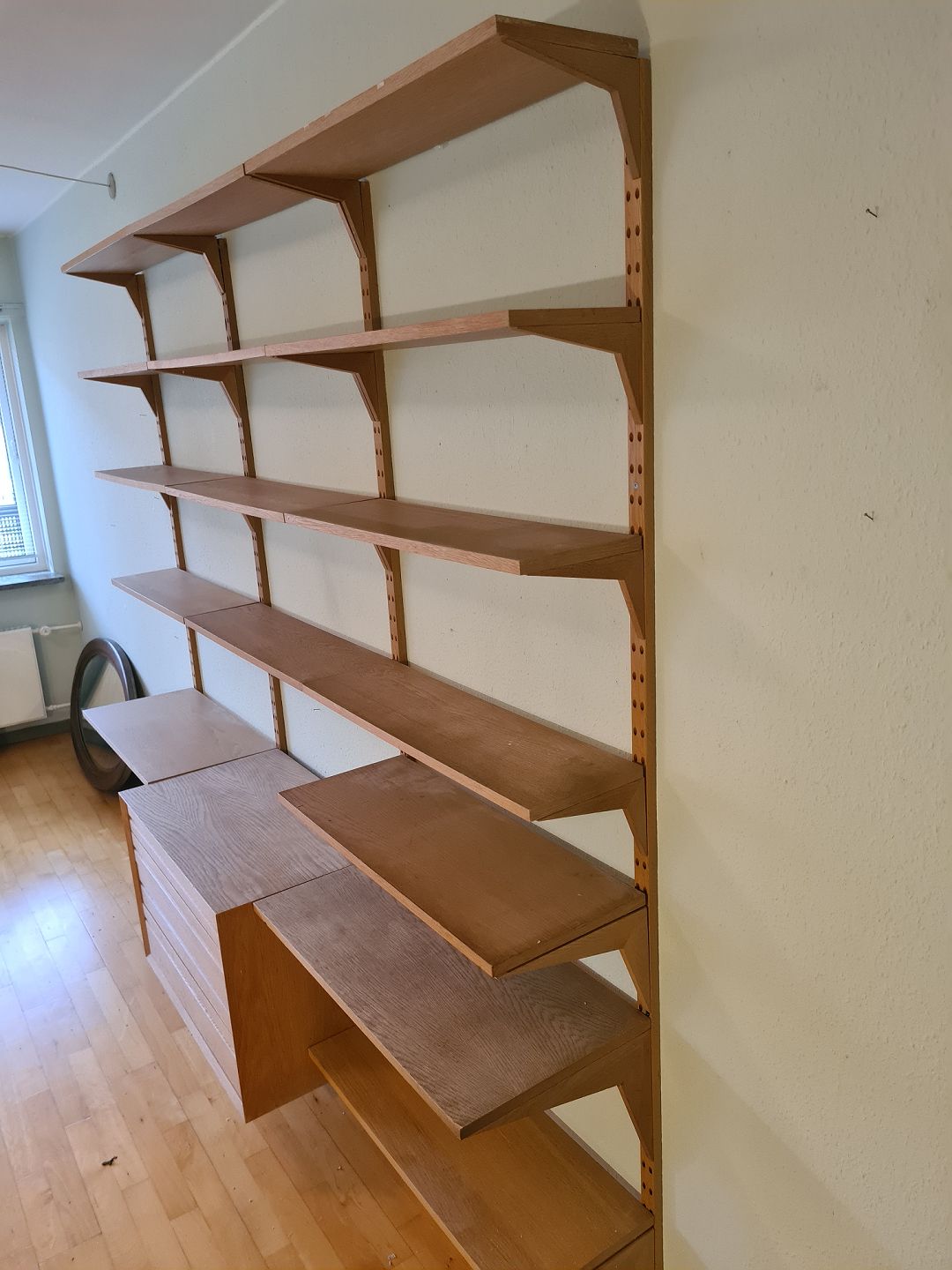 FM vægreolsystem fra 1960'erne i eg designet af Kai Kristiansen. Sættet består af 1 kommode (HxBxD 52x80x38), 2 hylder (HxBxD 2x80x38), 3 hylder (HxBxD 2x80x30), 12 hylder (HxBxD 2x80x33) og 4 vanger til ophængning. Generelt i pæn brugt stand dog svajer et par hylder en anelse. (Billede)Emne nummer: 60674