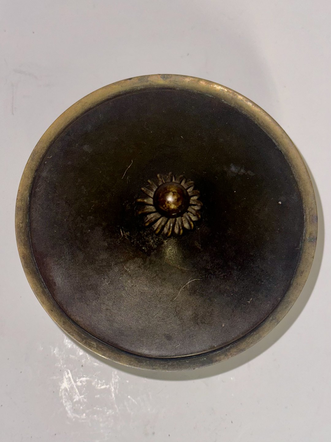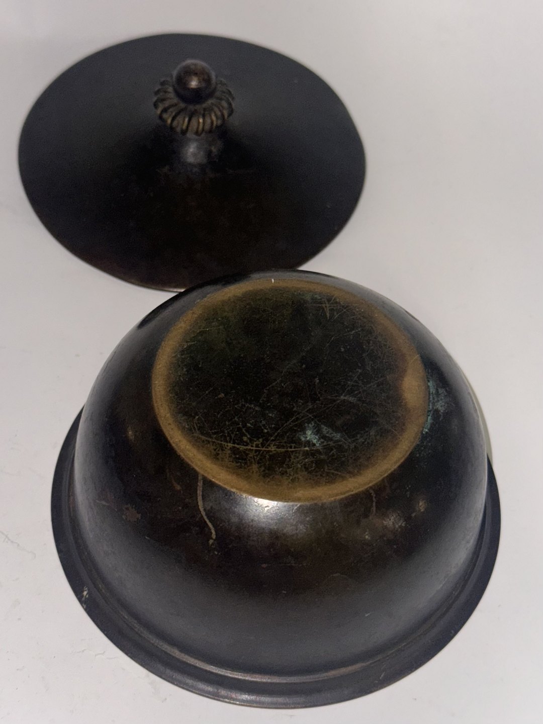 Bronzepatineret just Andersen skål. Fremstår i god stand med almindelige brugsspor. Fremstillet omkring 1940. Fabriksmærket på bunden med det velkendte fabrikslogo, modelnummer 1615 samt LB, der står for Let Bronce. H. 7 cm Ø. 11 cmv/ Jesper Reutemann