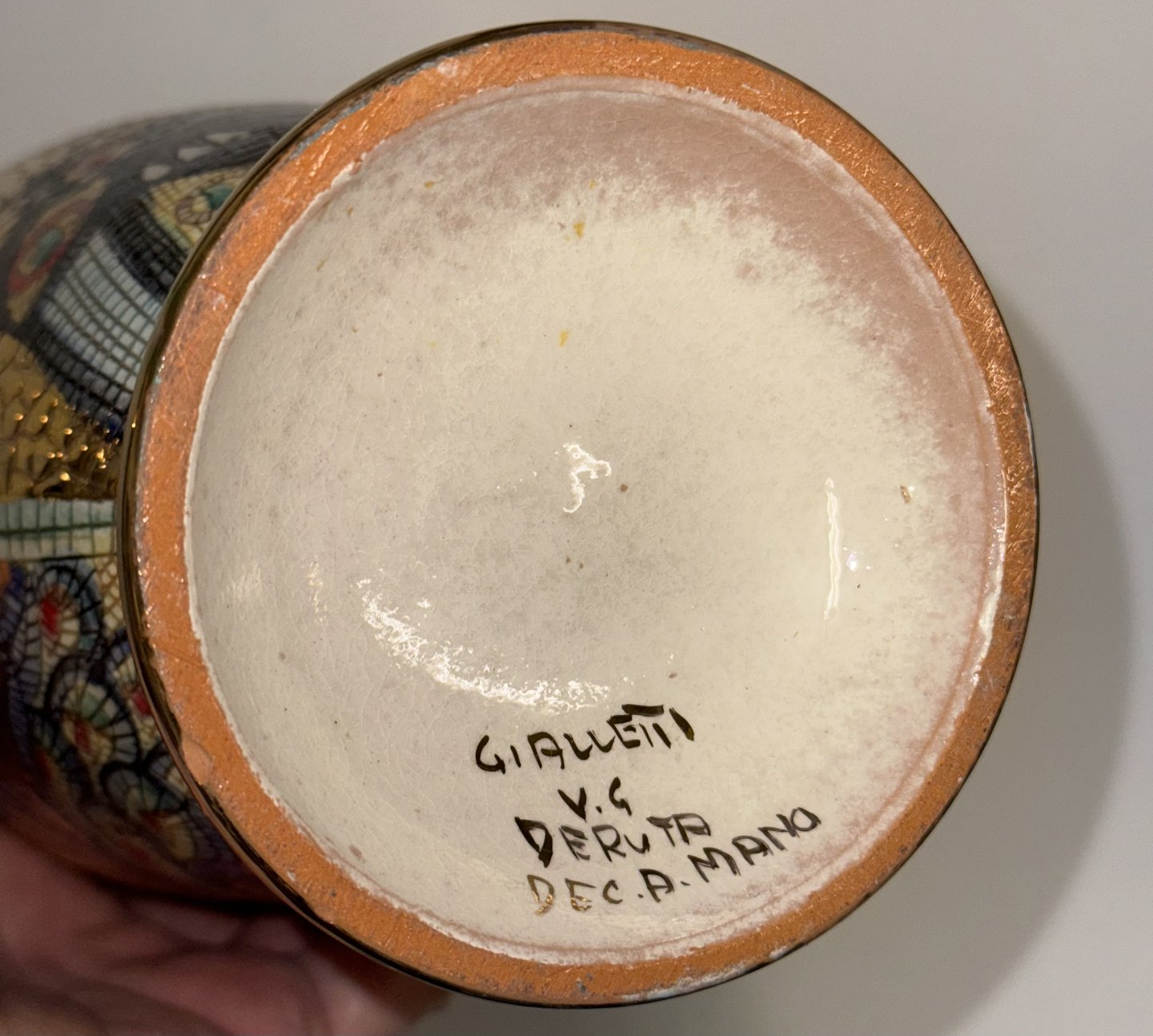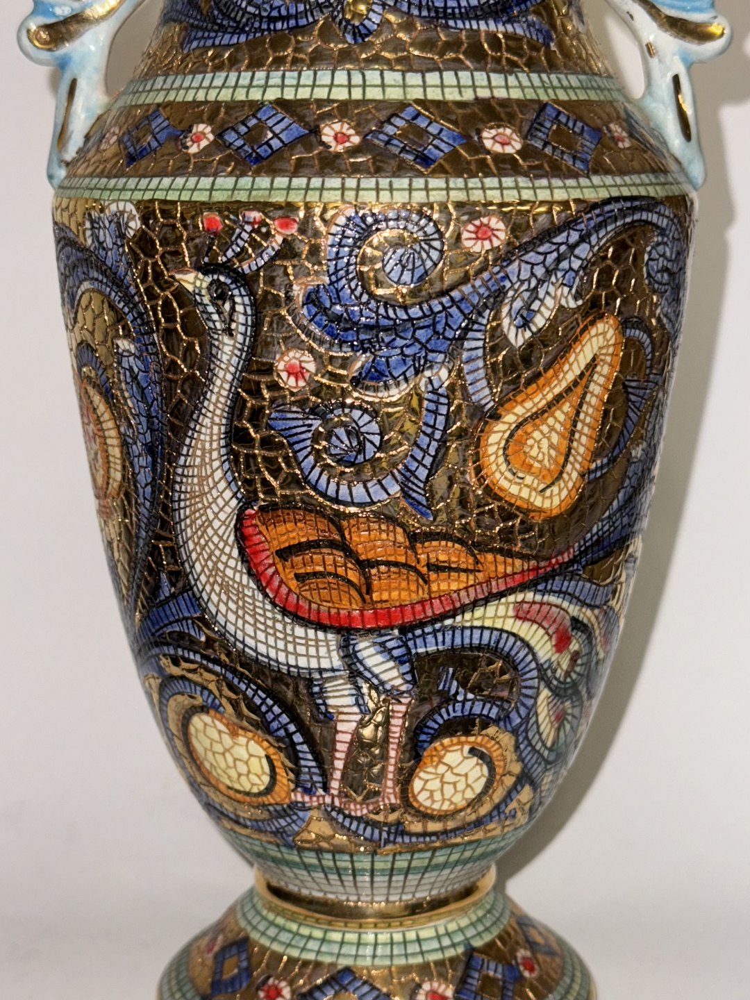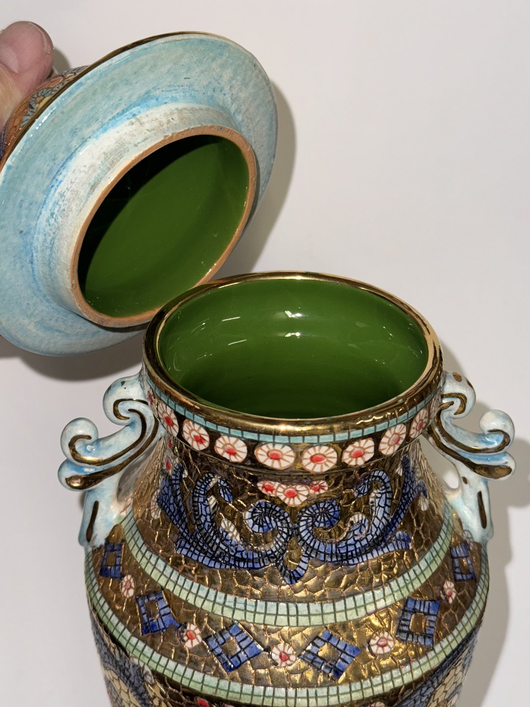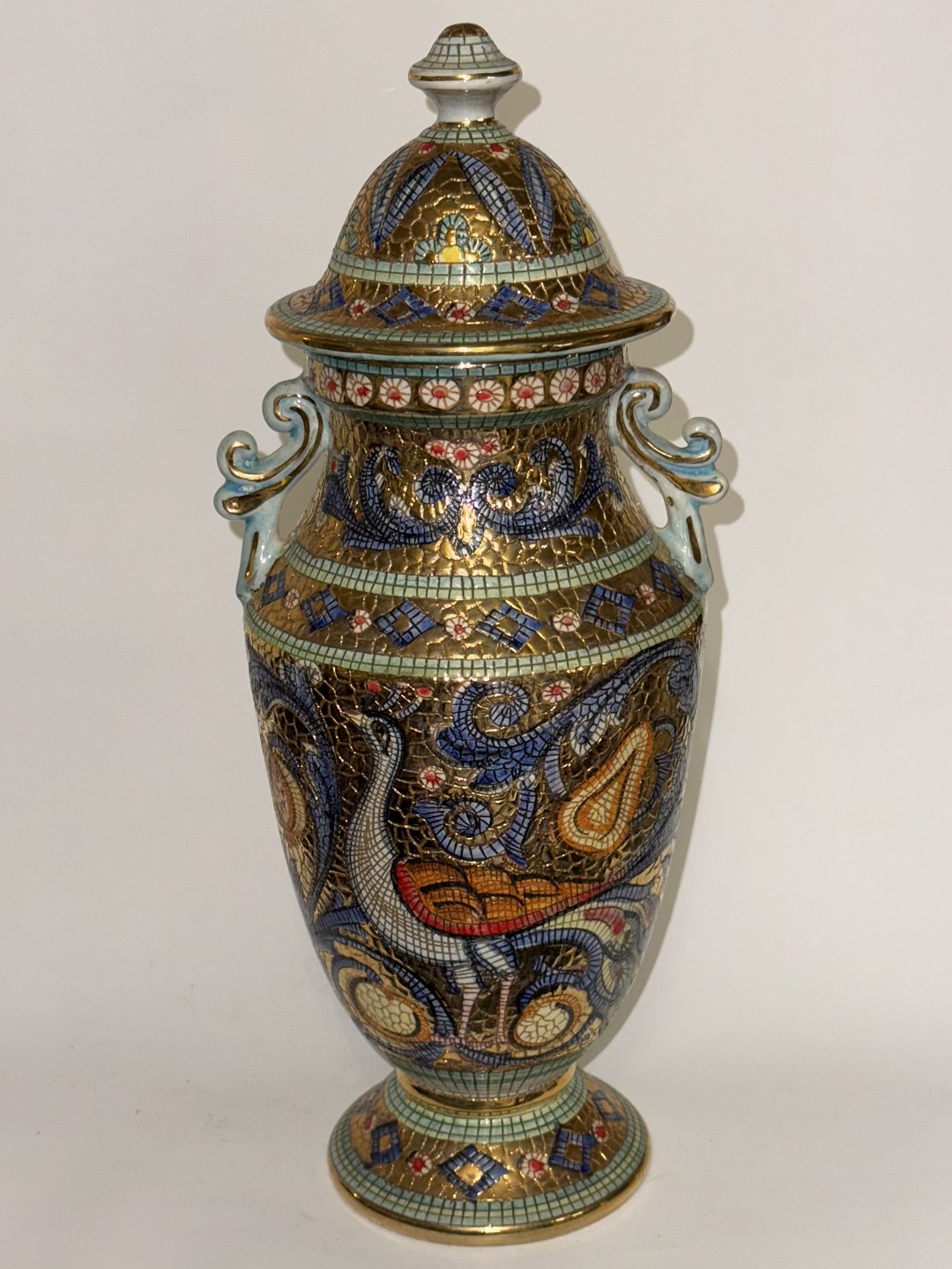 Deruta mosaik krukke med hanke og låg i majolika fremstillet i Umbrien i Italien. Motiv med afbildning af kejserinde Theodora, kejser Justinians byzantinske hustru fra det sjette århundrede, senere kanoniseret af den østlige ortodokse kirke som Saint Theodora. På bagsiden motiv med påfugl. Mosaik-designet er indgraveret med hånden, direkte på vasen, i stedet for små påsatte stykker. Emnet har et meget farvestærkt udtryk med metallisk overflade. Fremstår i god stand. Fabrikamærket på bunden. H. 33,5 cm inklusiv låg.v/ Jesper Reutemann