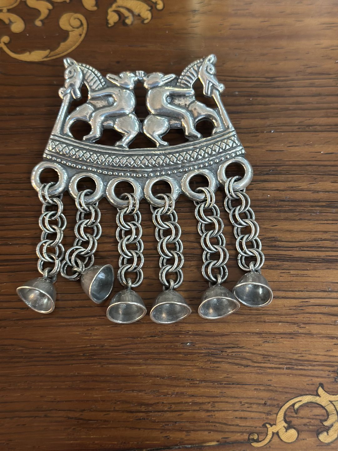 Vintage og meget stærkt smykket er lavet af kalevala Krou Finlands mest kendte smykkefirmaer .Broche inspireret af amuletter som skulle bringe held og beskytte mod onde ånder