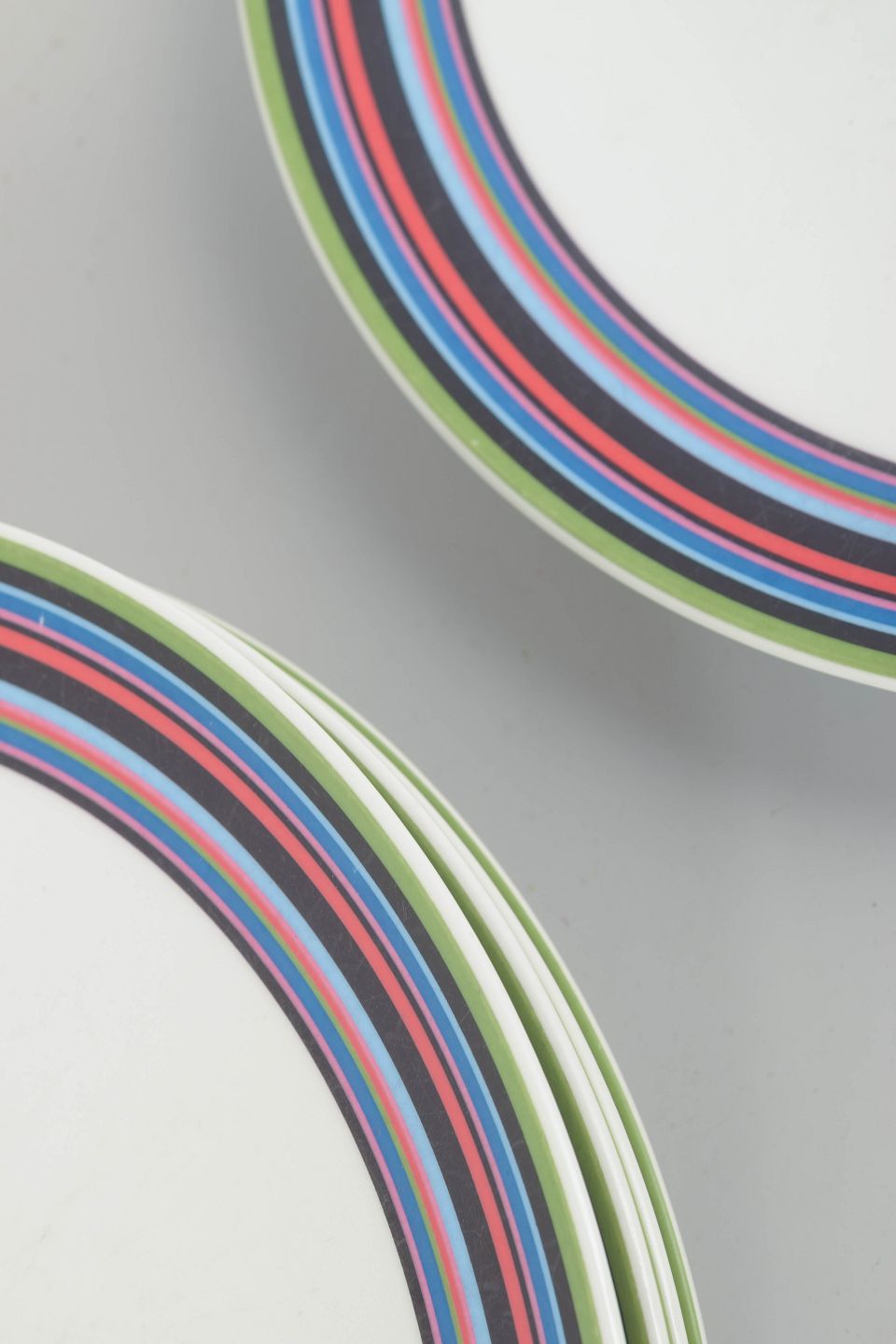 Sæt med fem store tallerkener i porcelæn med det karakteristiske flerfarvede stribemønster designet af Alfredo Häberli for Iittala. Serien kombinerer funktionalitet med legende farver og et tidløst formsprog, som har gjort den til en moderne klassiker inden for nordisk design.