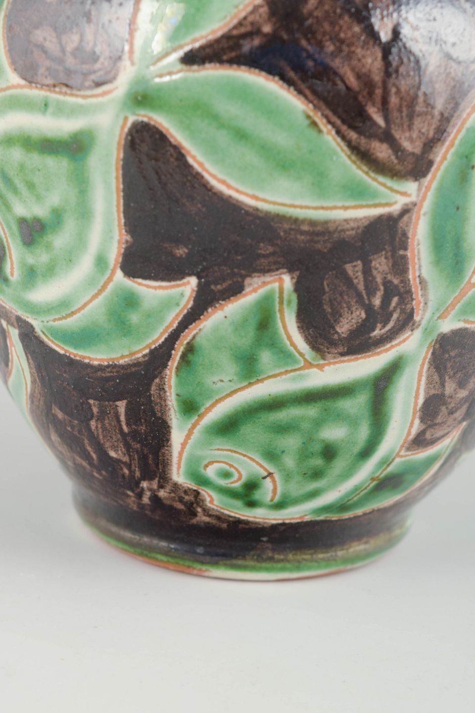 Humlebæk Keramik, vase, midten af 1900-tallet.Dekorativ vase i glaseret lertøj med reliefdekoration forestillende fisk og tang i grønne og brune nuancer. Et karakteristisk eksempel på dansk midt-århundredes værkstedsproduktion med naturinspirerede motiver og livlig farvekontrast.