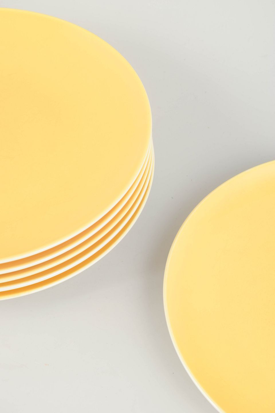 Sæt af seks "Susanne" middagstallerkener i fajance fra Aluminia i den karakteristiske gule “Confetti”-glasur. Enkel og tidstypisk formgivning med bløde linjer og glat overflade – et klassisk eksempel på dansk funktionalistisk design fra perioden.