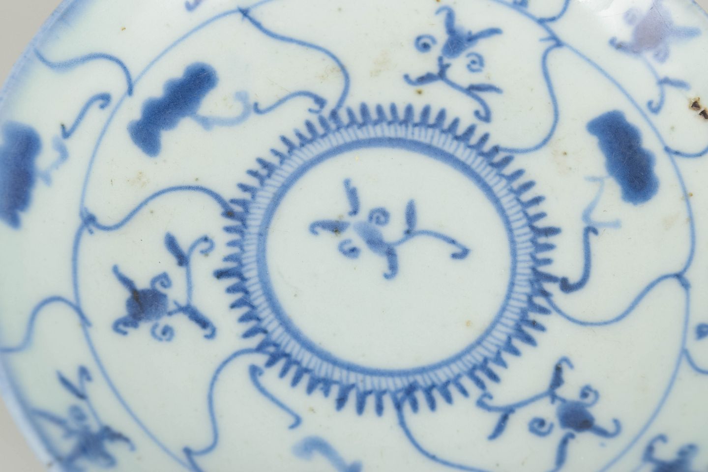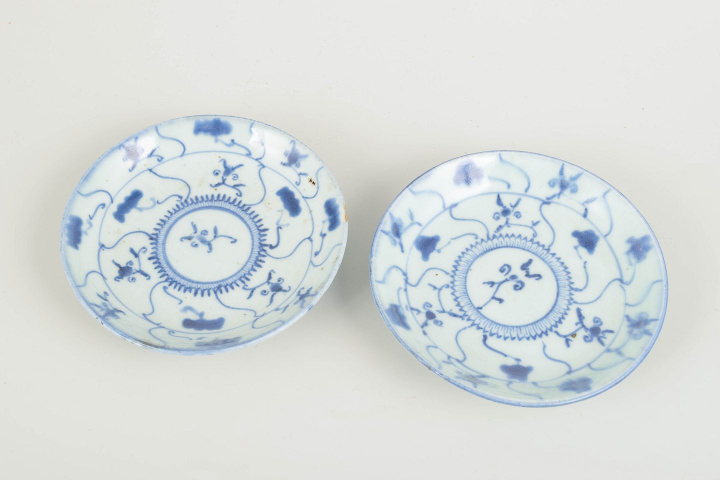 Kinesiske porcelænstallerkener, 1800-tallet.To små tallerkener i hvidt porcelæn dekoreret i underglasur blå med blomster- og rankemotiv, udført i klassisk kinesisk stil. Undersiden med blå dobbeltcirkellinje og firkantet mærke. Naturlige jernpletter fra 1800-tallets produktion.