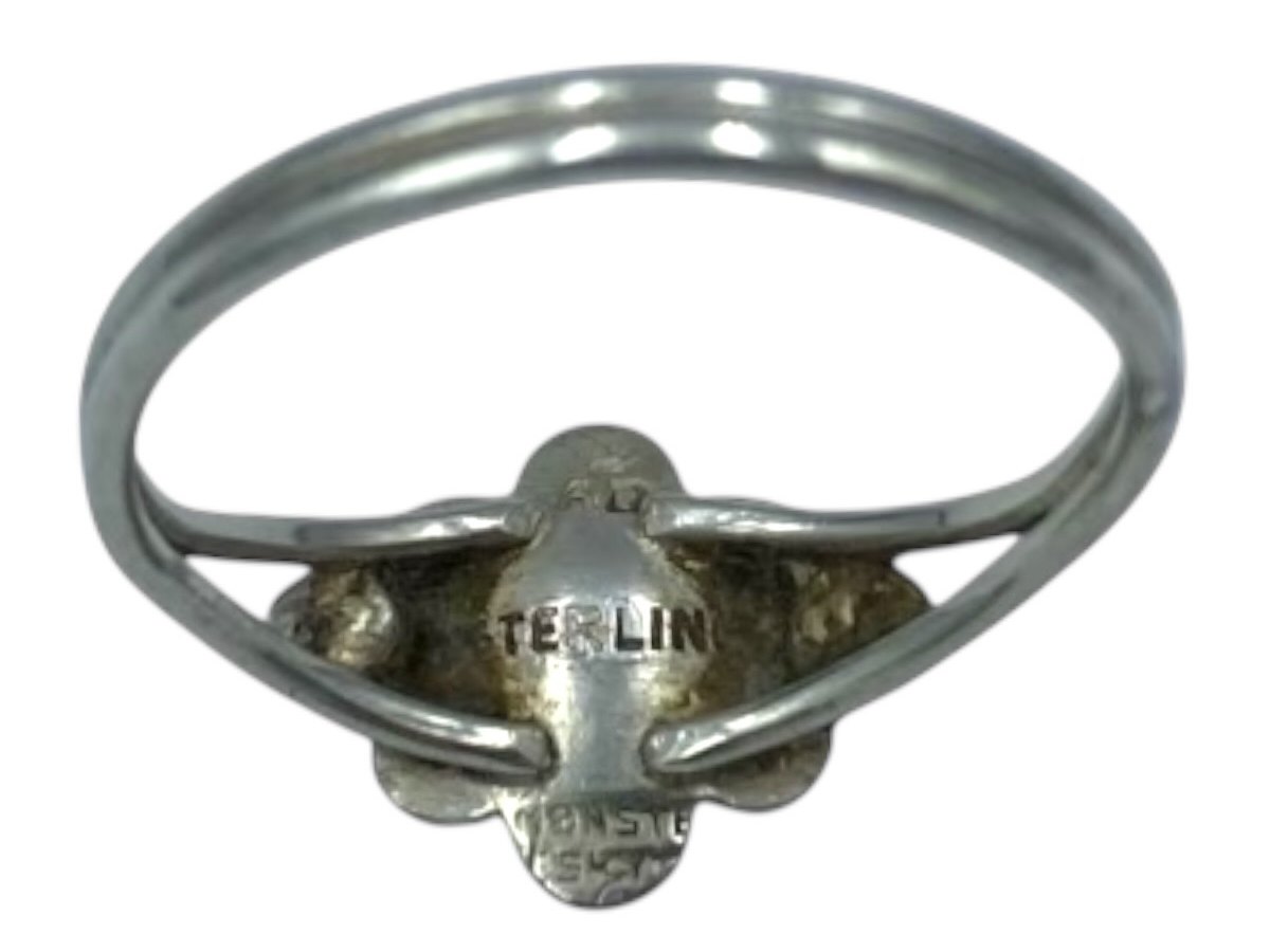 A. Dragsted, ring med hvid emalje blomst.Stemplet "A.D STERLING". A dragsted var sølvsmed i København fra 1893. Denne er fra ca. 1950'erne.