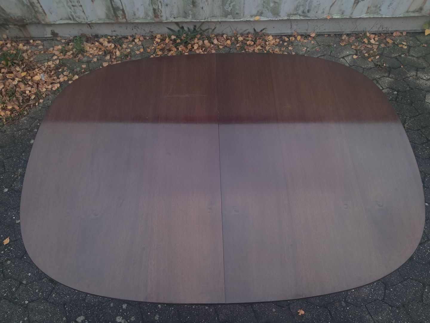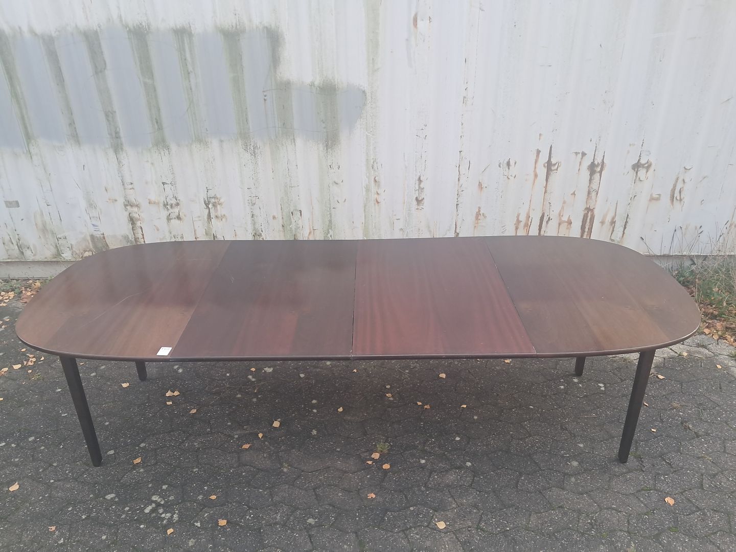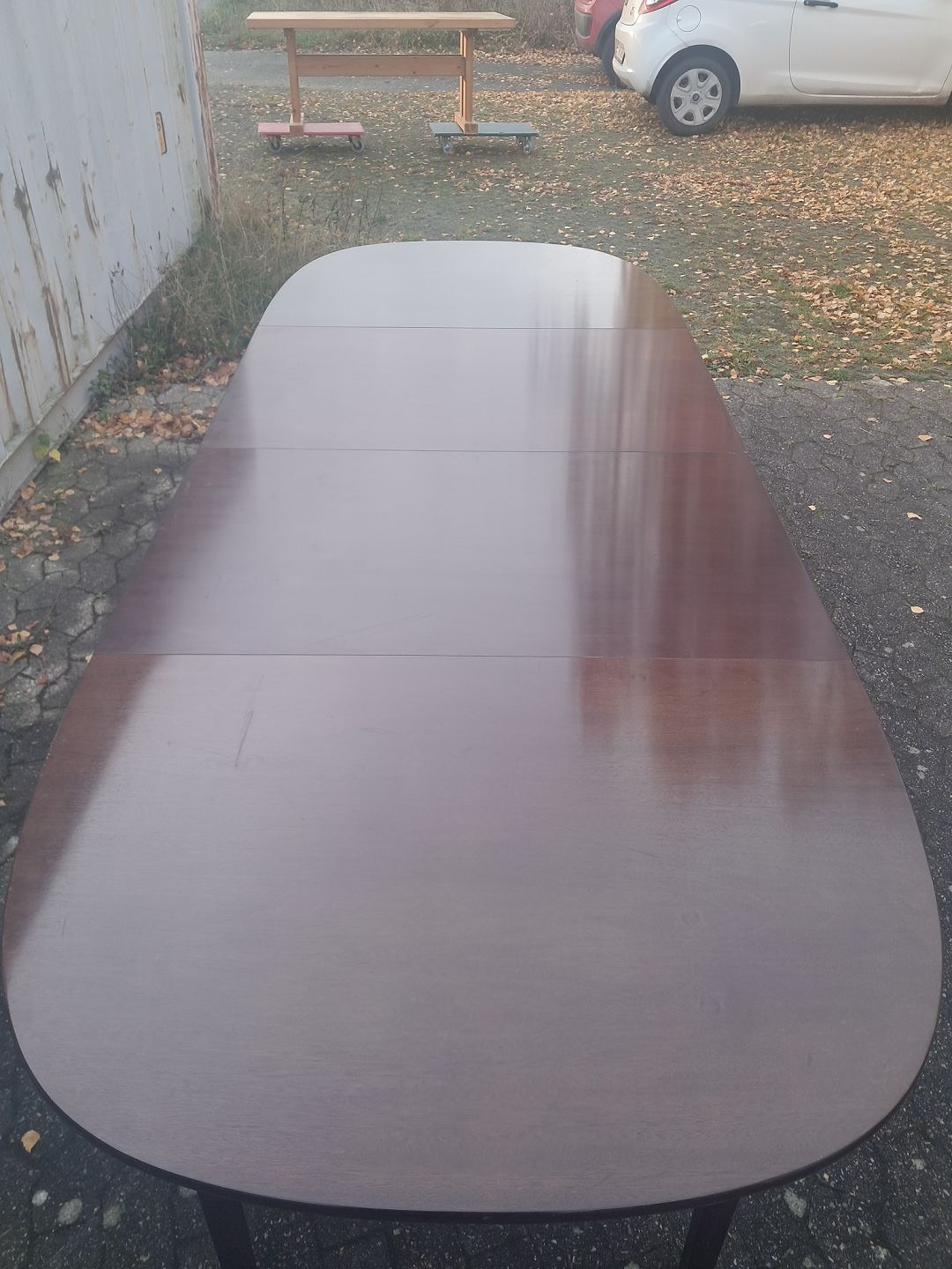 Ole Wanscher spisebord i fineret mahogni med 2 tillægsplader fra 1970erne.Det har brugsspor og lakken bobler lidt op på benene. (se foto)