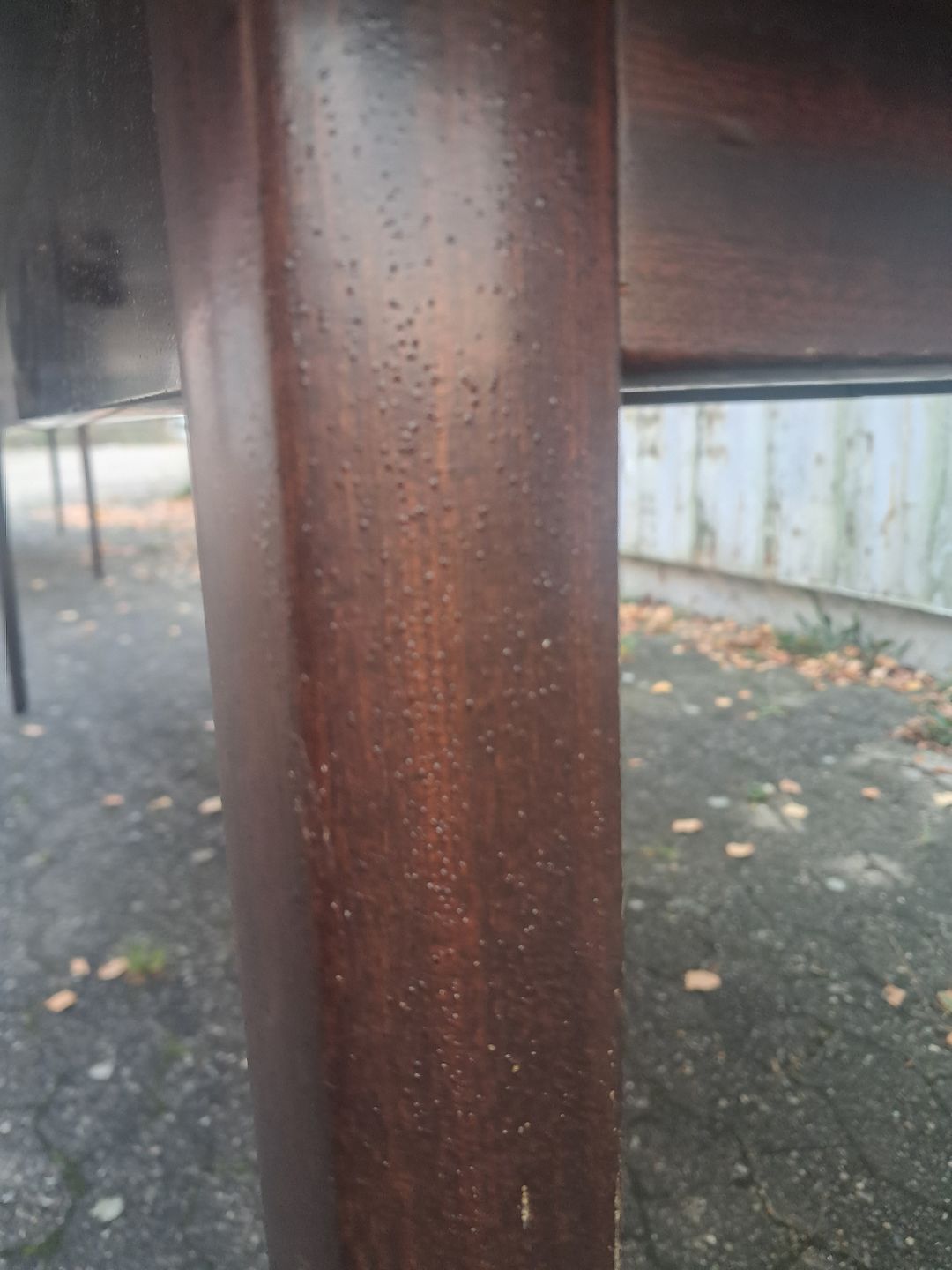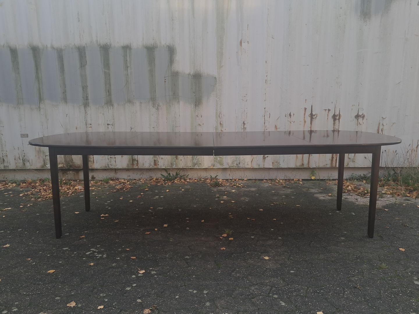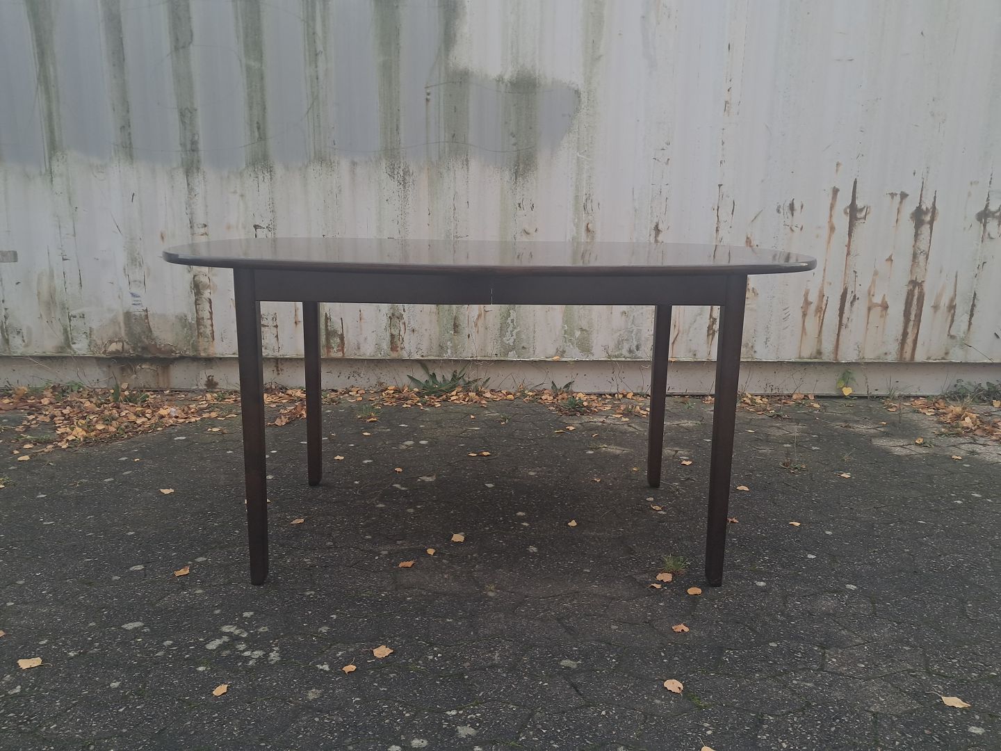 Ole Wanscher spisebord i fineret mahogni med 2 tillægsplader fra 1970erne.Det har brugsspor og lakken bobler lidt op på benene. (se foto)