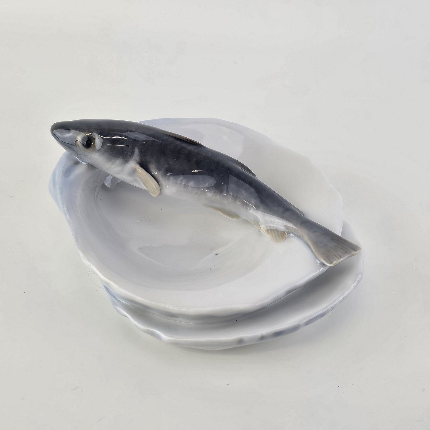 Sjælden skål i kongeligt porcelæn i art nouveau stil med form af to muslingeskaller med en fisk