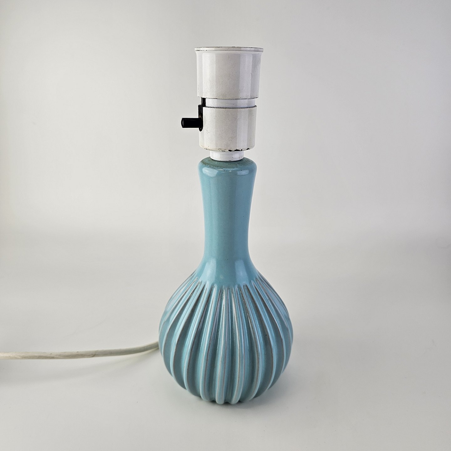 Rund bordlampe i rillet grønblå keramik med hvid fatningProducent Eslau