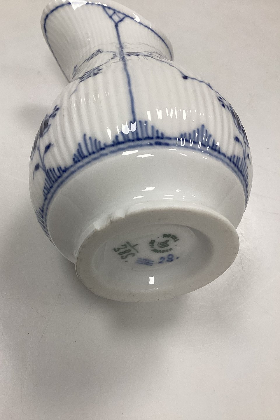 Royal Copenhagen Musselmalet Riflet Flødekande No. 385. Har små afslag i bunden, se foto.Måler 12,5 cm / 4,92 in. 2. Sortering