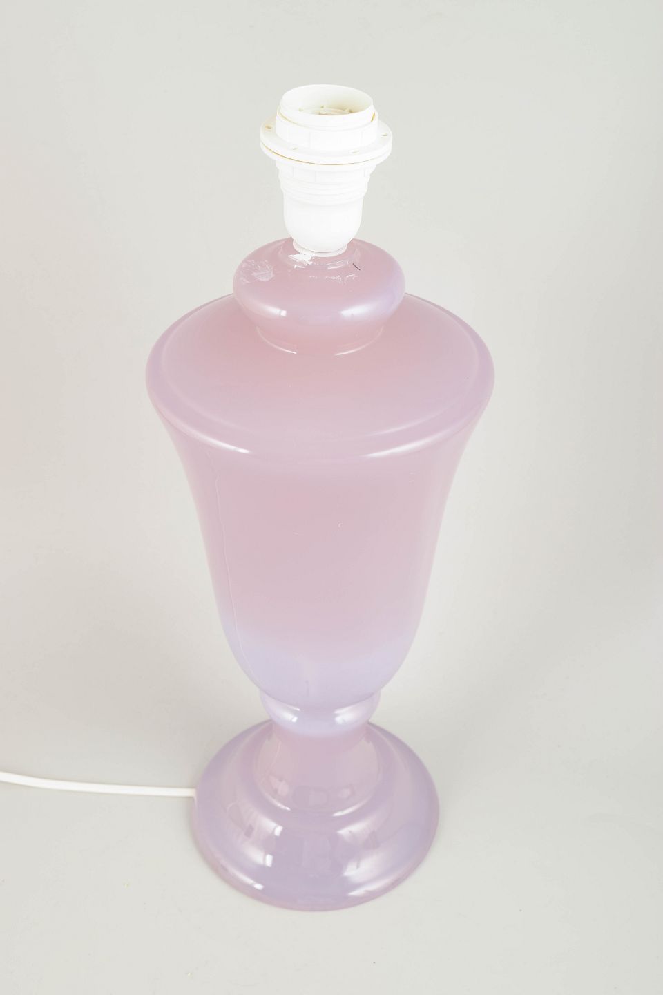 Elegant bordlampe i mundblæst glas med blød turkis/lilla tone og klassisk urneformet fod. Original fatning, ledning udskiftet senere.