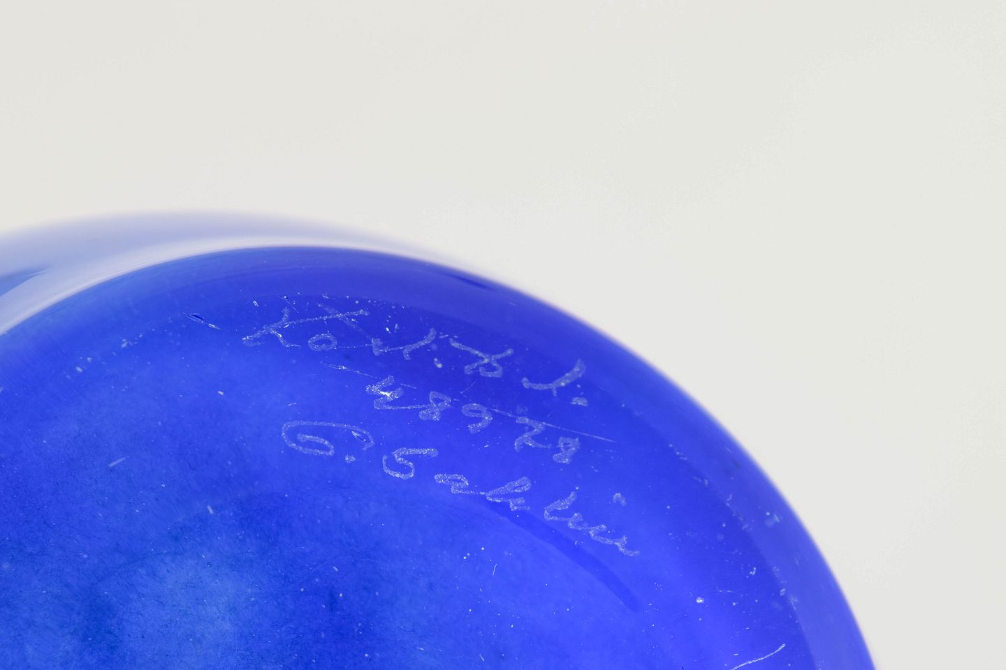 Organisk formet vase i blåt gennemfarvet glas med bløde, bølgende konturer, karakteristisk for Sahlin’s legende formsprog hos Kosta Boda i 1990’erne.
