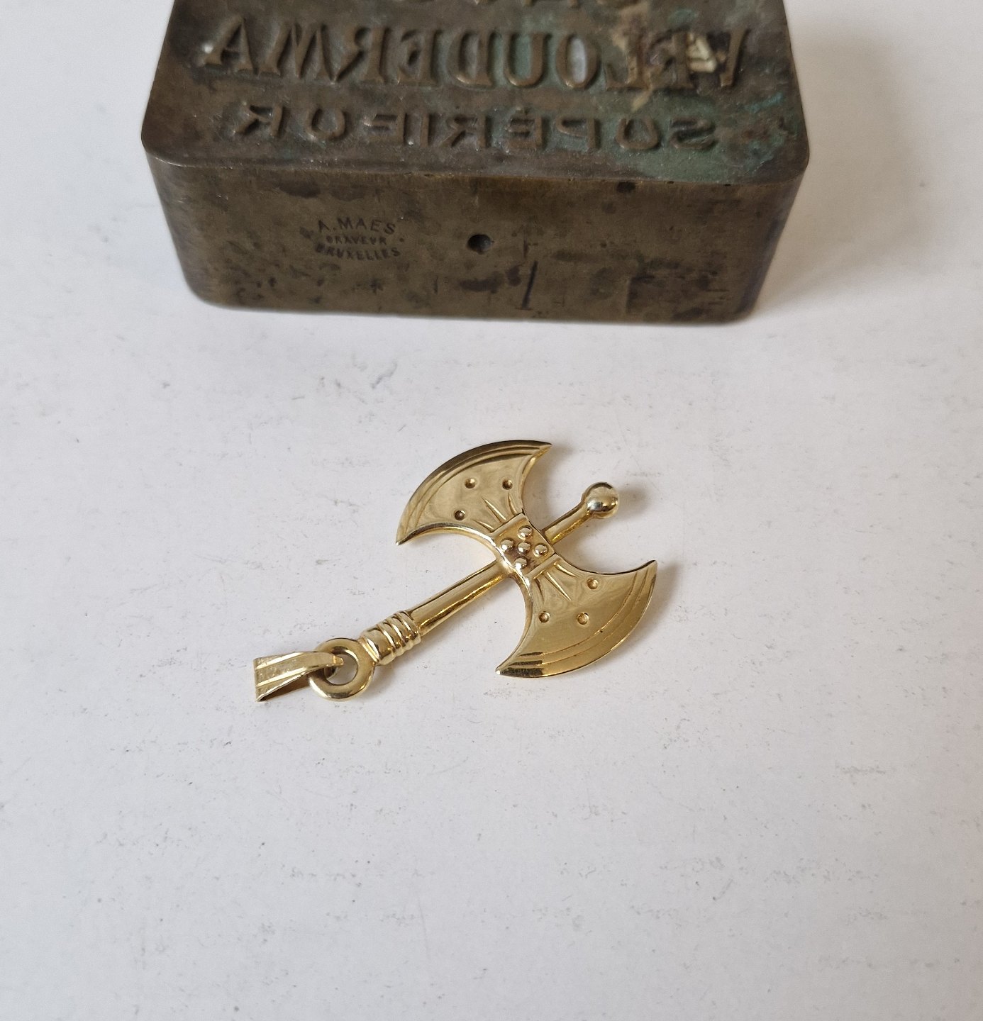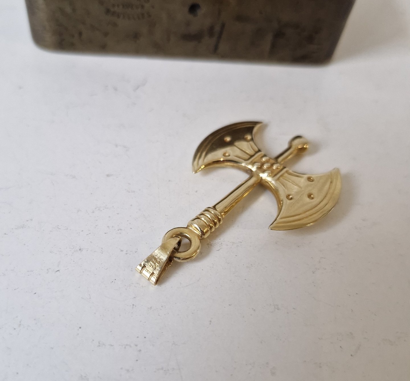 Græsk vedhæng i 14kt guld, udført som dobbeltøkse - Labrys.Øksen kendes fra Kreta - Knossos.