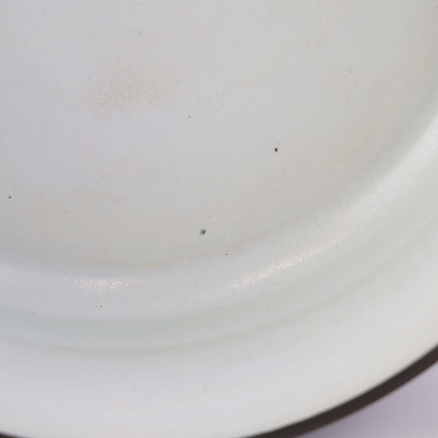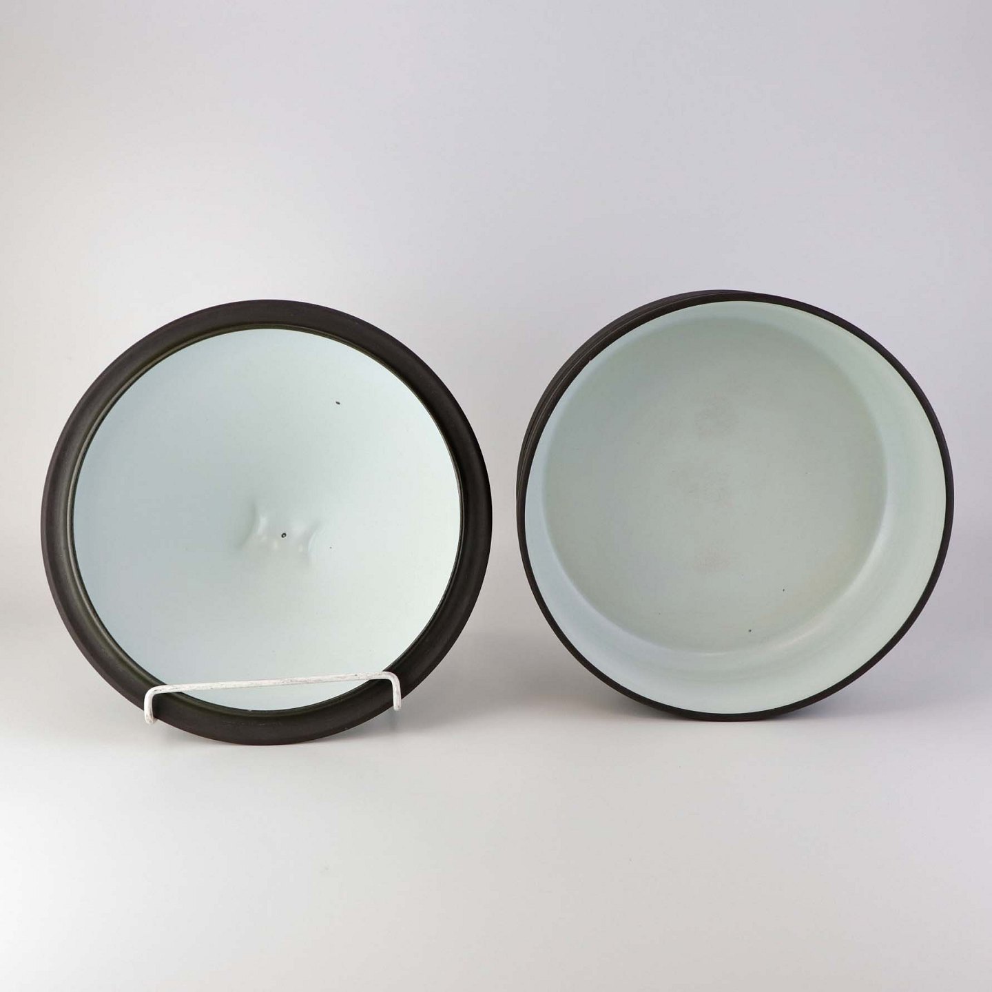 Fremstår med mindre ujævnhed ved skålens kant, enkelte sorte nister i glasuren på skål og låg samt brugsspor under bunden.