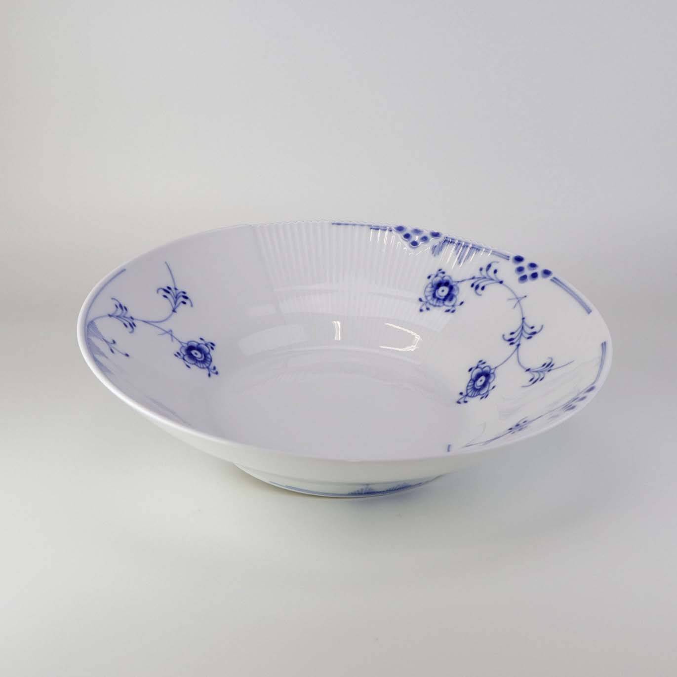 Service i glat porcelæn med let riflet kant og blå dekoration