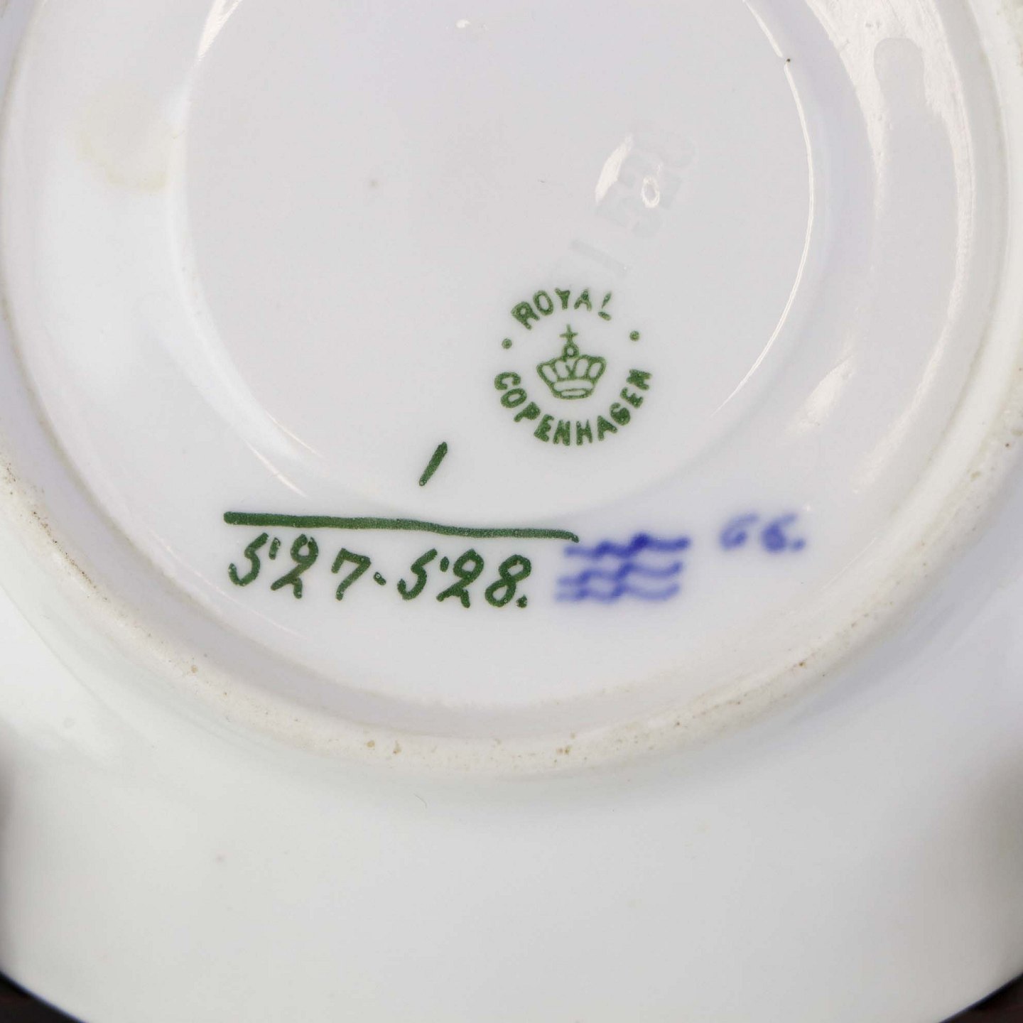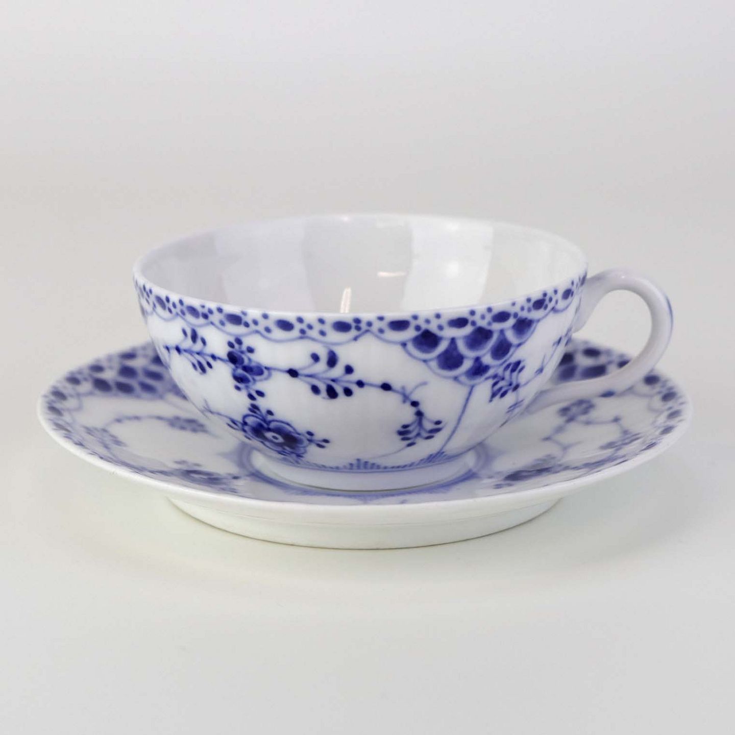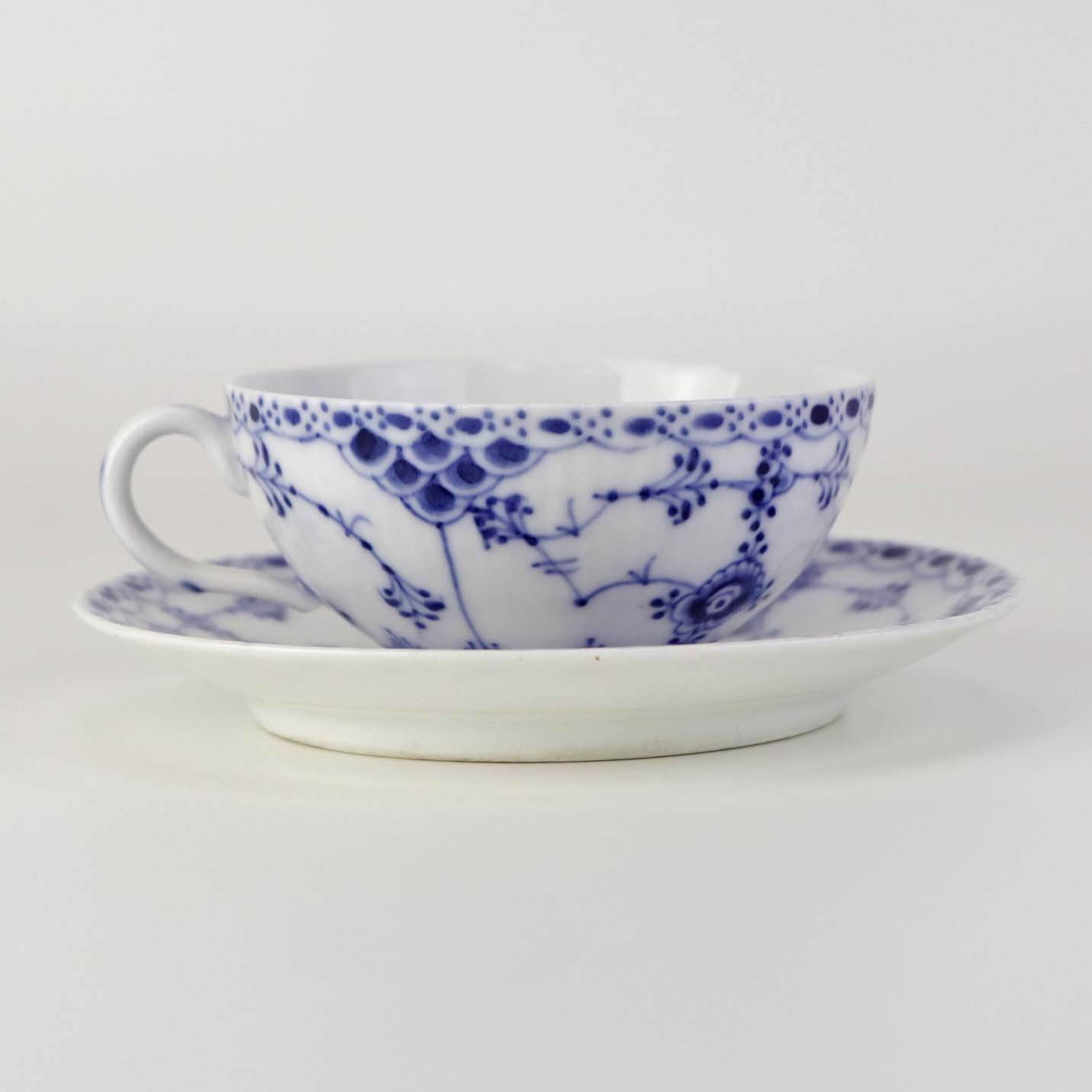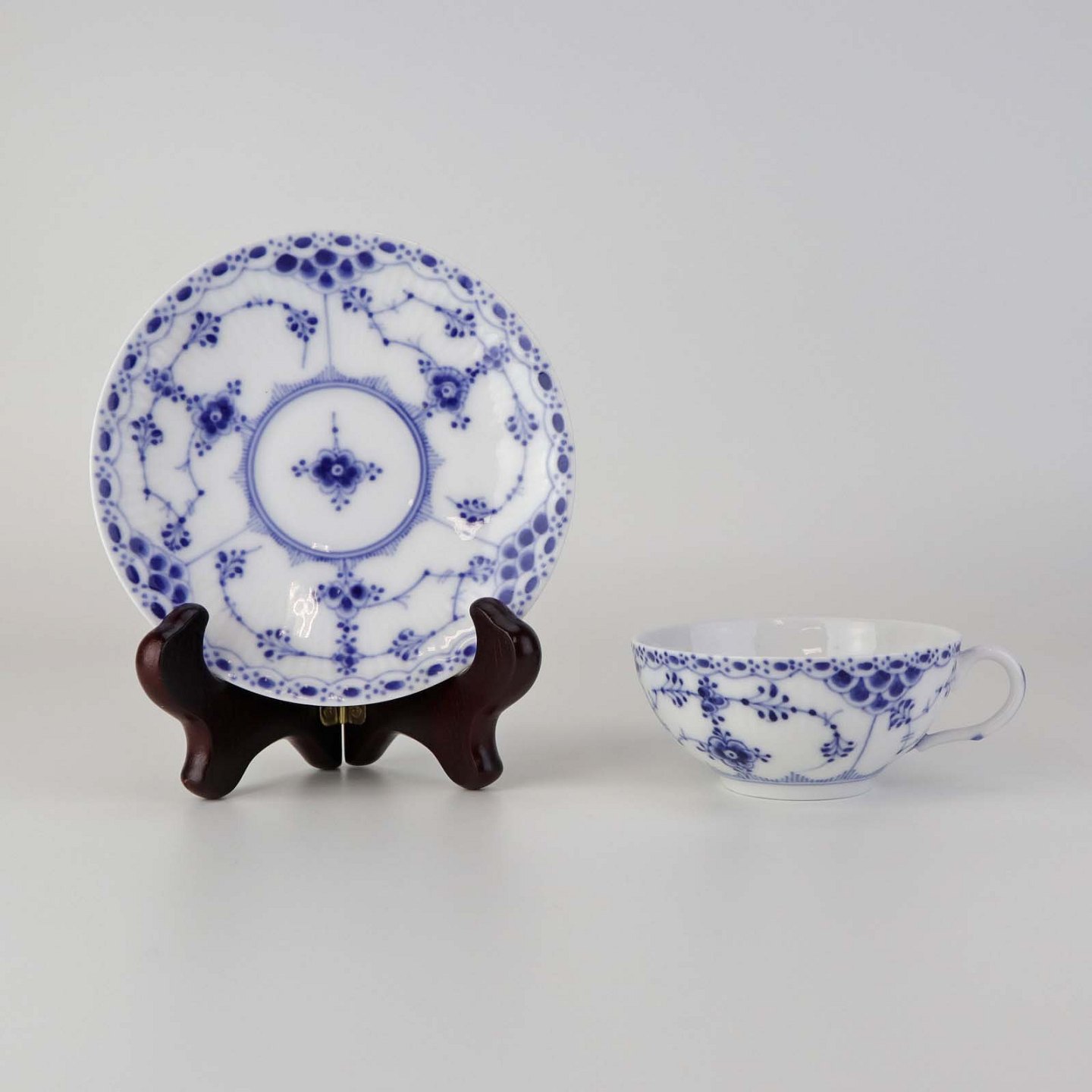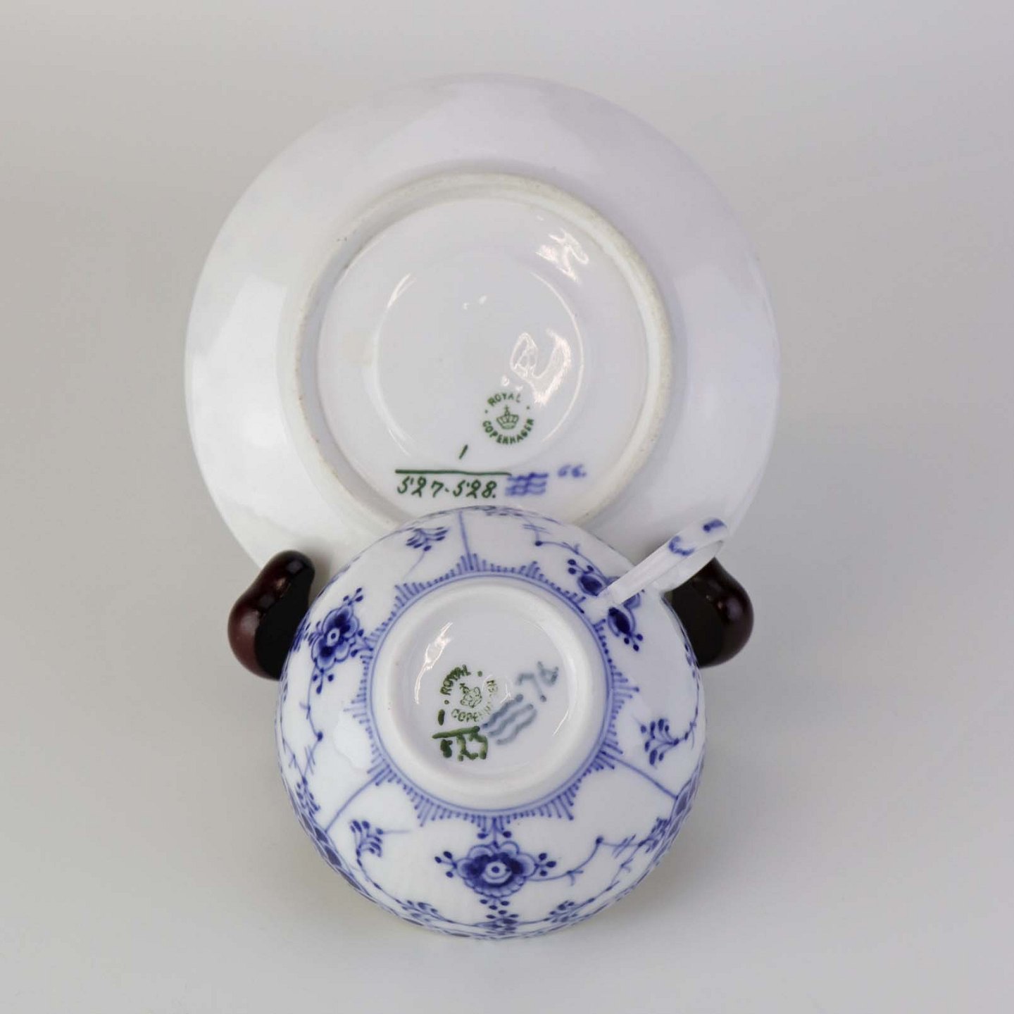Lille tekop med underkop i kongeligt porcelæn fra stellet Musselmalet Halvblonde. Nr. 1/523 og 1/527-528Design Arnold Krog