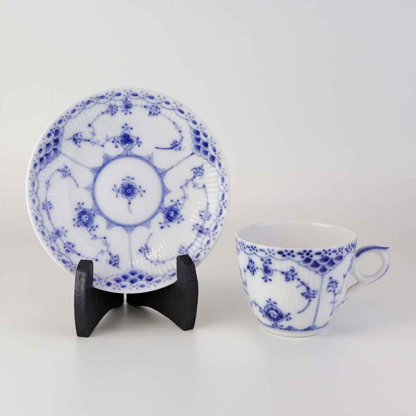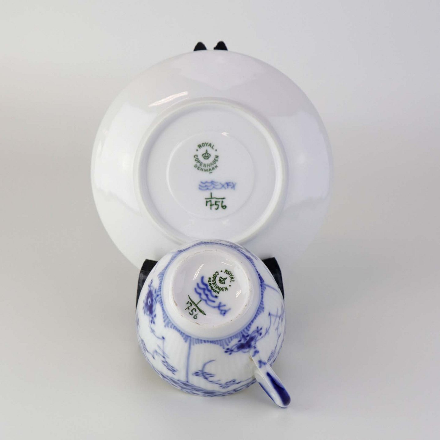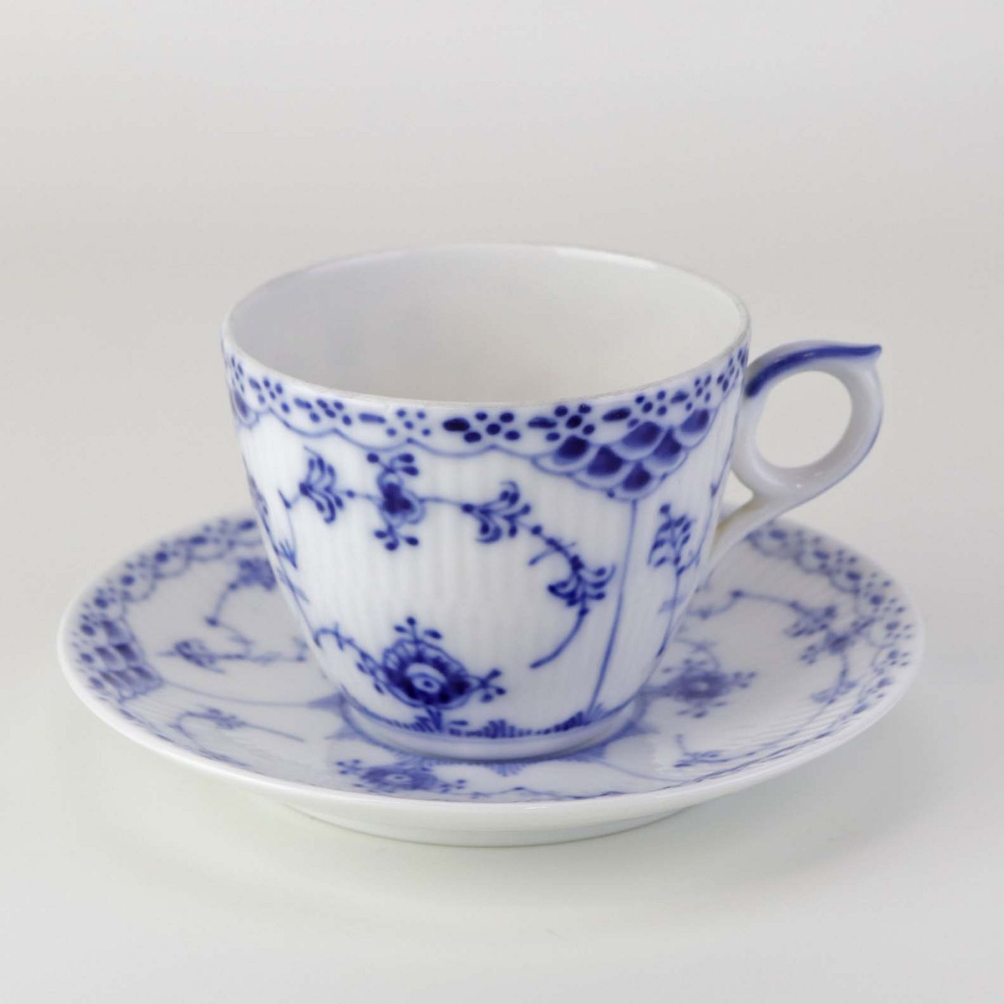 Stor kaffekop med underkop i kongeligt porcelæn fra stellet Musselmalet Halvblonde. Nr. 1/756Design Arnold Krog