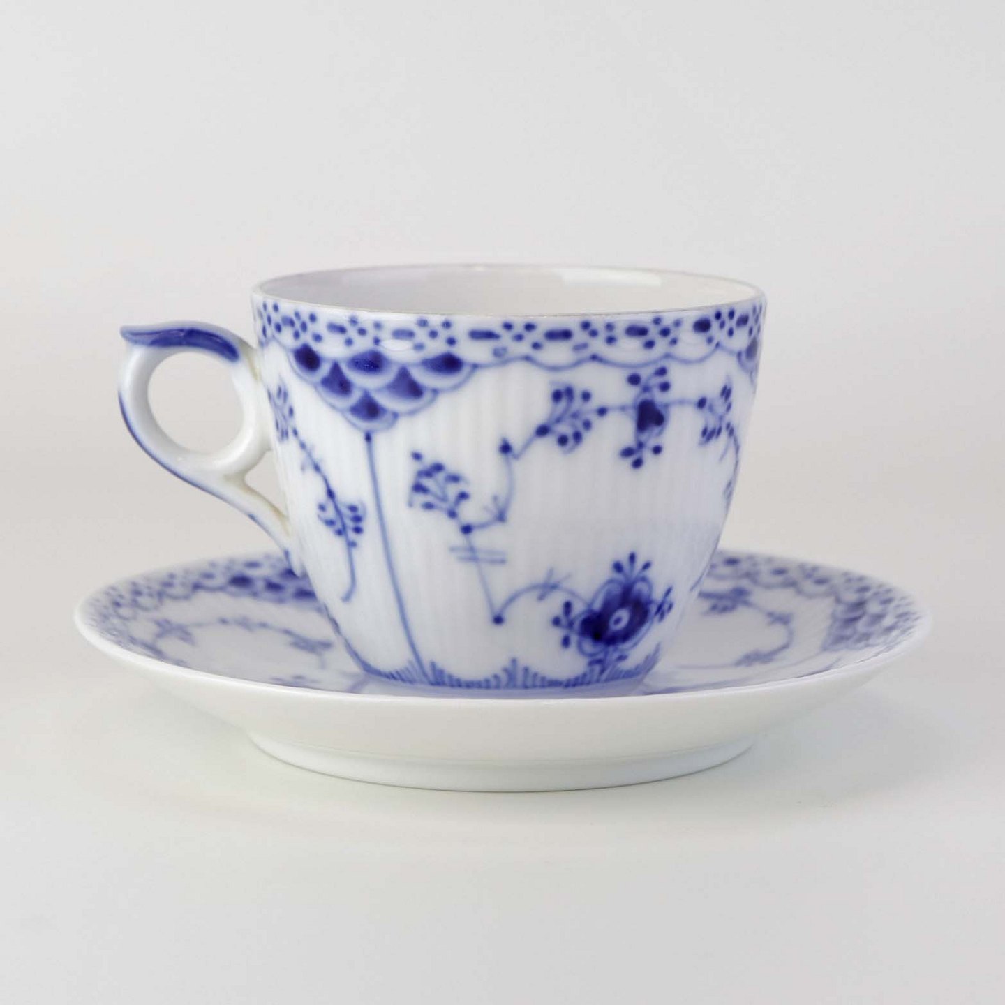 Musselmalet halvblonde er riflet hvidt porcelæn med dekoration af blå ranker og en kant med blonder.