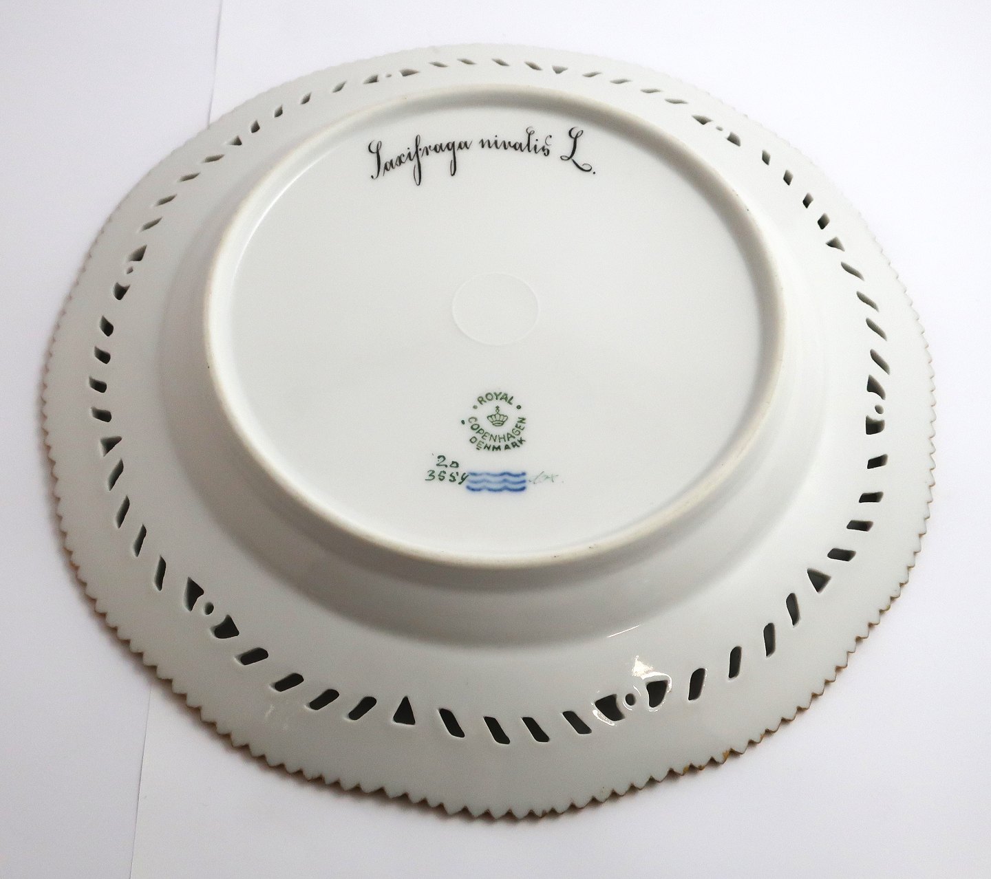 Royal Copenhagen, Flora Danica. Frokost tallerken med gennemskåret bort. Design #3554. Diameter 23 cm. (1 sortering). Saxifraga nivalis L Udstiller