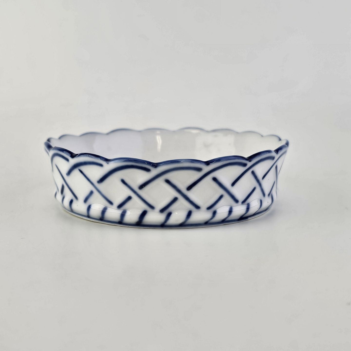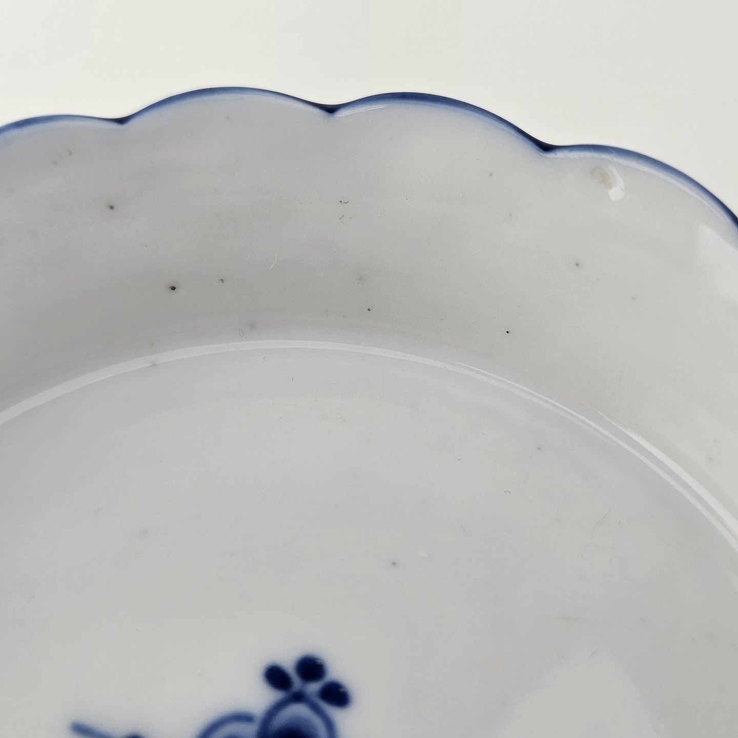 Musselmalet er af kongeligt hvidt porcelæn, dekoreret med mønster af blå ranker og blomster