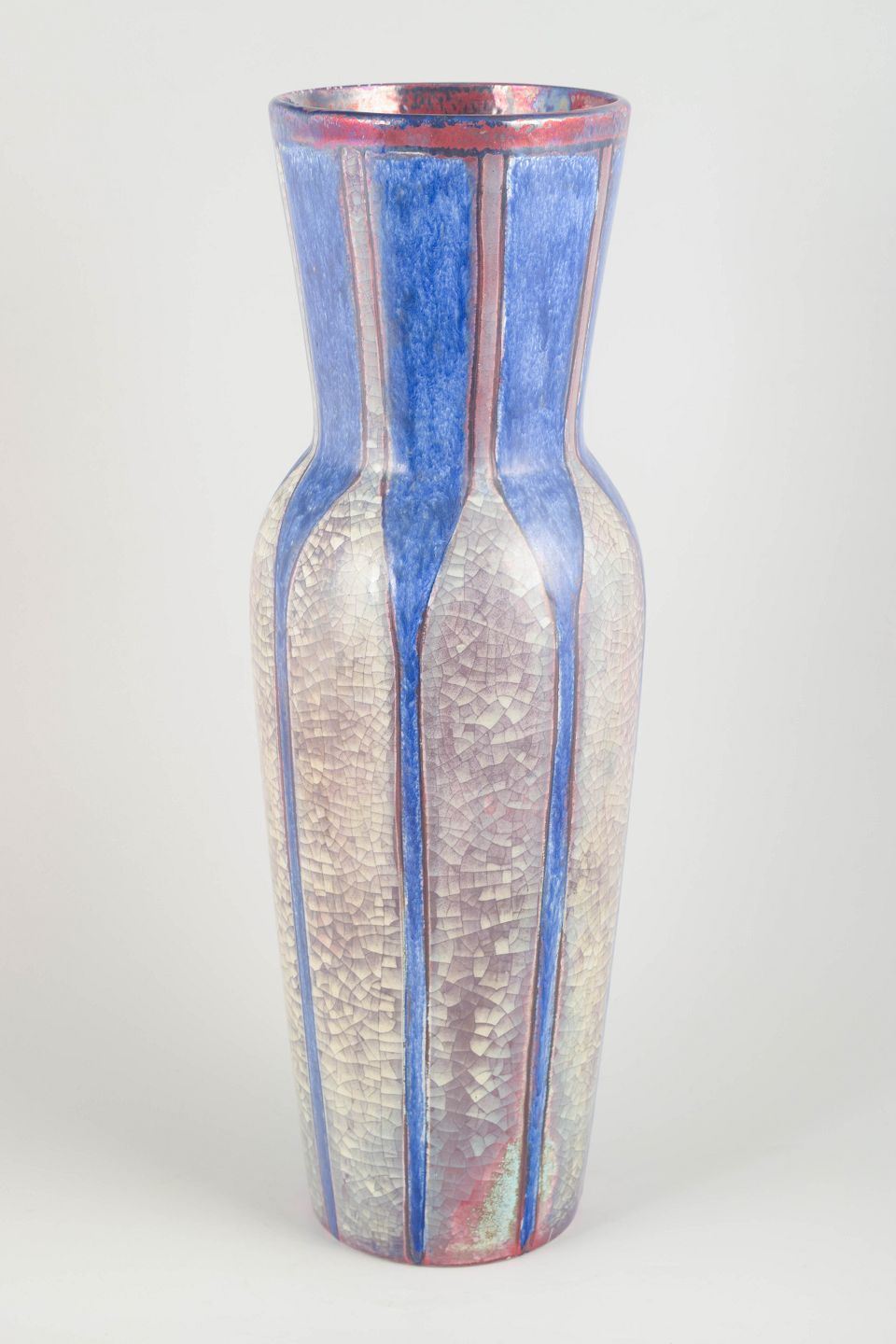 Imponerende højt skaftet vase i keramisk lertøj med stærk iriserende glasur i blå, sølv og røde nuancer. Den facetterede, geometriske form er karakteristisk for Starcks arbejde hos Michael Andersen på Bornholm.