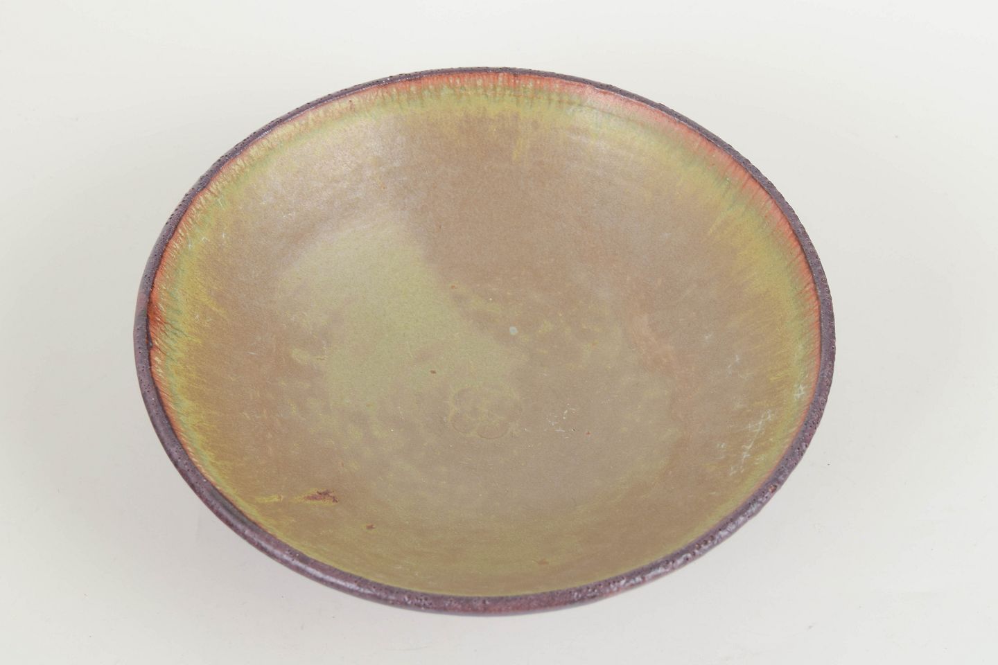 Hånddrejet skål i stentøj med let konisk form, underskål og en smuk glasur i varme grønne og brunlige nuancer.