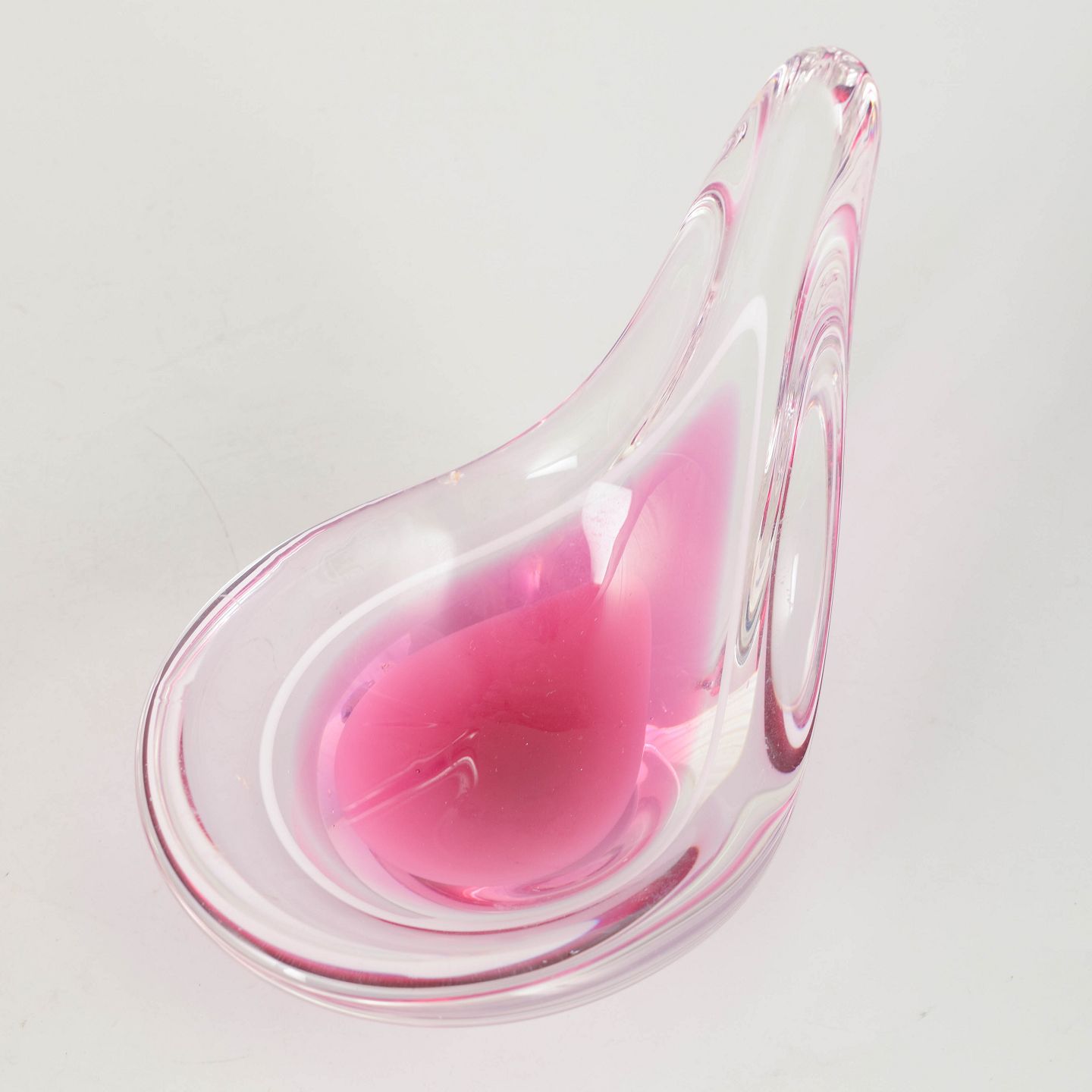 Elegant “Coquille”-skål i flerlaget kunstglas med rosa indfarvning og klart yderlag, udført i den karakteristiske asymmetriske, opadbuede form, som kendetegner Kedelvs organiske glasdesign.