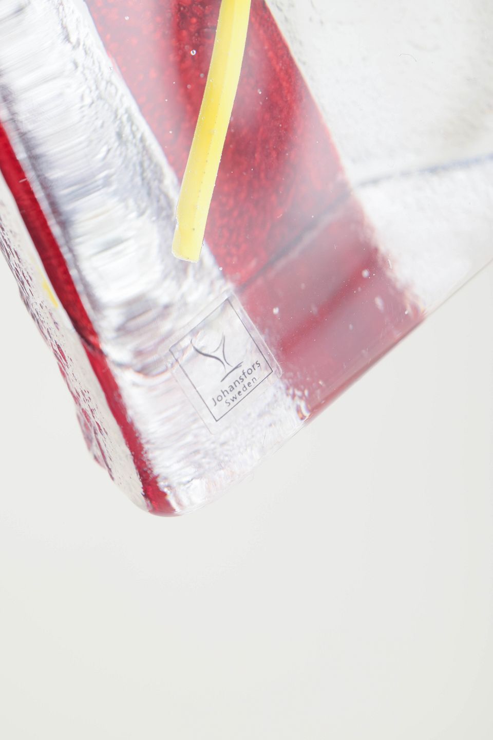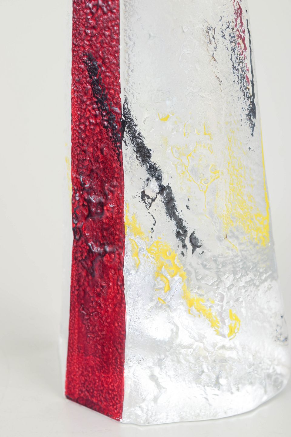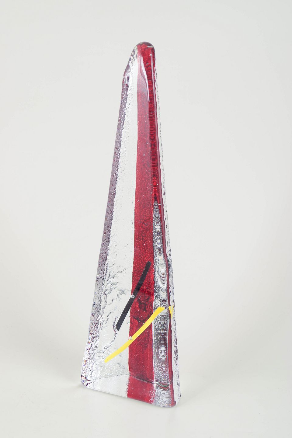 Høj, trekantet art-glass skulptur i klart glas med markant rød indre kerne samt gule og sorte farveindslag. Originalt Johansfors Sweden klistermærke bevaret.