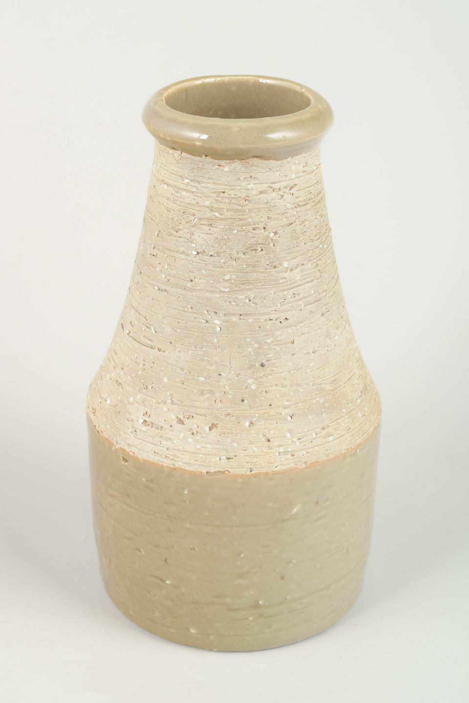 Cylindrisk vase i stentøj med kombination af glaseret og uglaseret overflade. Den øverste del har en rå, taktil struktur, mens den nederste del er glaseret i en lys beige/grønlig tone.