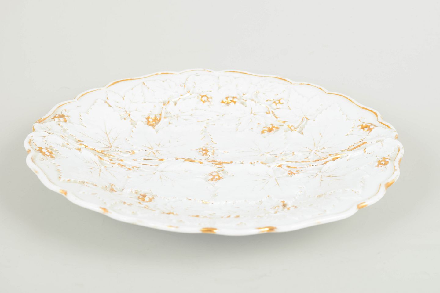 Porcelænsfad fra Meissen med reliefformet bladdekor og håndmalede gulddetaljer. Et elegant og klassisk sen-1800-tals stykke med bølgede kanter og fint udførte naturmotiver.
