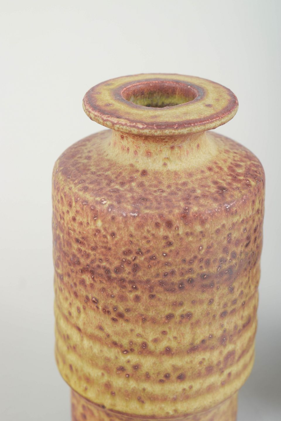 Par af hånddrejede stentøjsvaser med karakteristisk Mobach-tekstur og mat, nuanceret glasur i henholdsvis gule og rødbrune toner. De cylindriske former og den taktile overflade er typiske for værkstedets modernistiske udtryk.