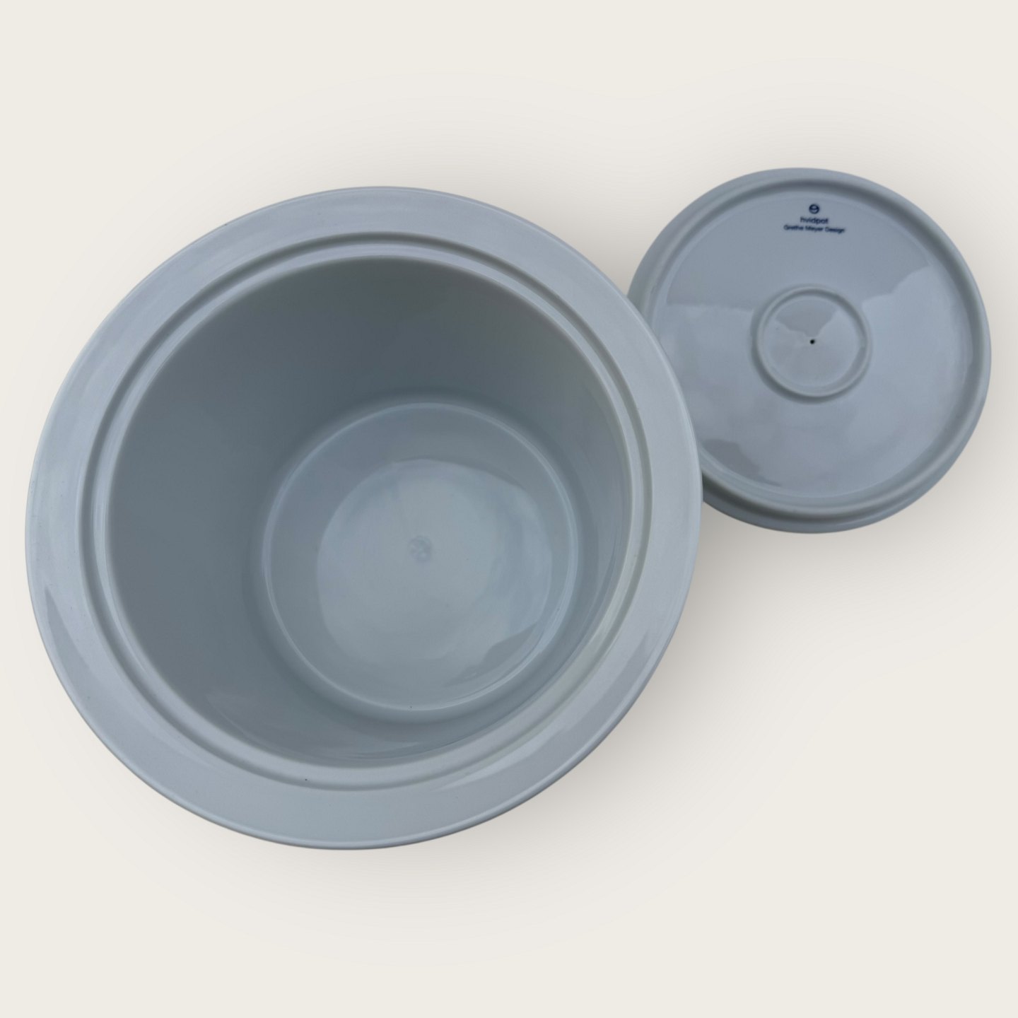Hvidpot, Royal Copenhagen og COOP, Stor skål med låg, 22cm i diameter, 14,5cm høj, 1.sortering, Design Grethe Meyer *Perfekt stand*