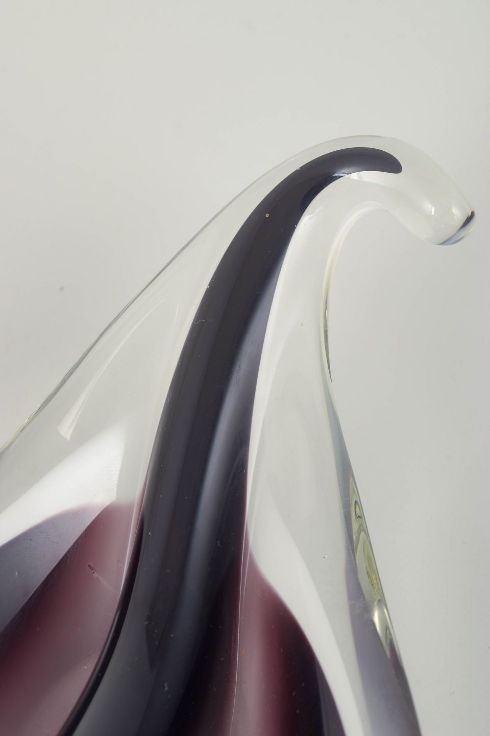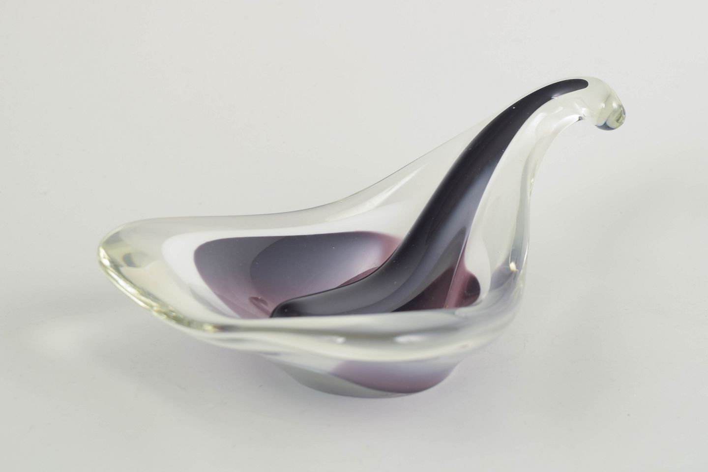 Organisk formet kunstglas skål i klart og violet tonet glas, mundblæst med den karakteristiske svungne form fra Kedelvs berømte Coquille-serie.