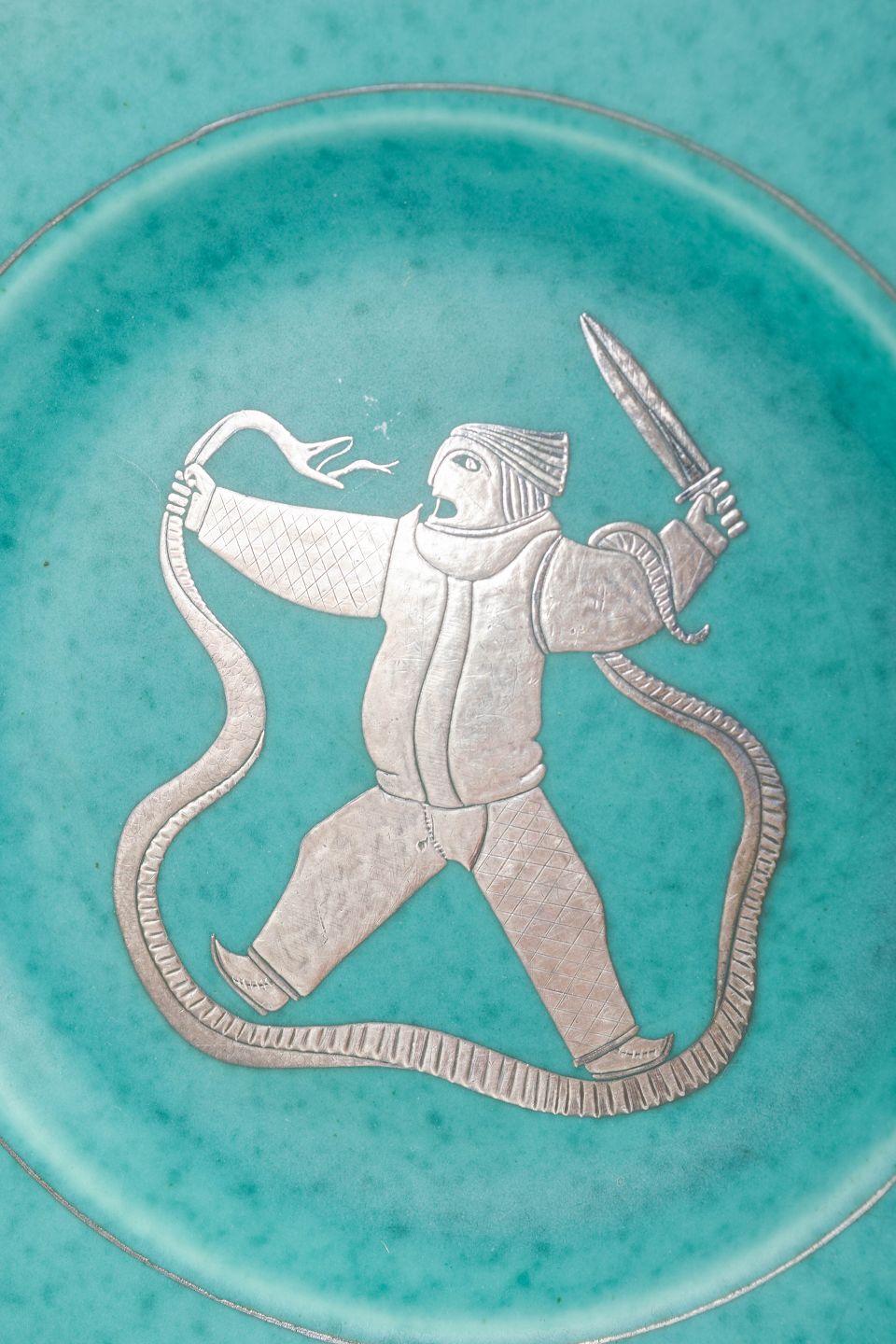 Stort dekorativt fad i den ikoniske turkise Argenta-glasur med indlagt sølvmotiv. Centralt figurmotiv i mytologisk stil, udført med Kåges karakteristiske stregarbejde, omgivet af en kant med sølvdekorerede fletdetaljer. Et markant og sjældnere Argenta-stykke i stort format.