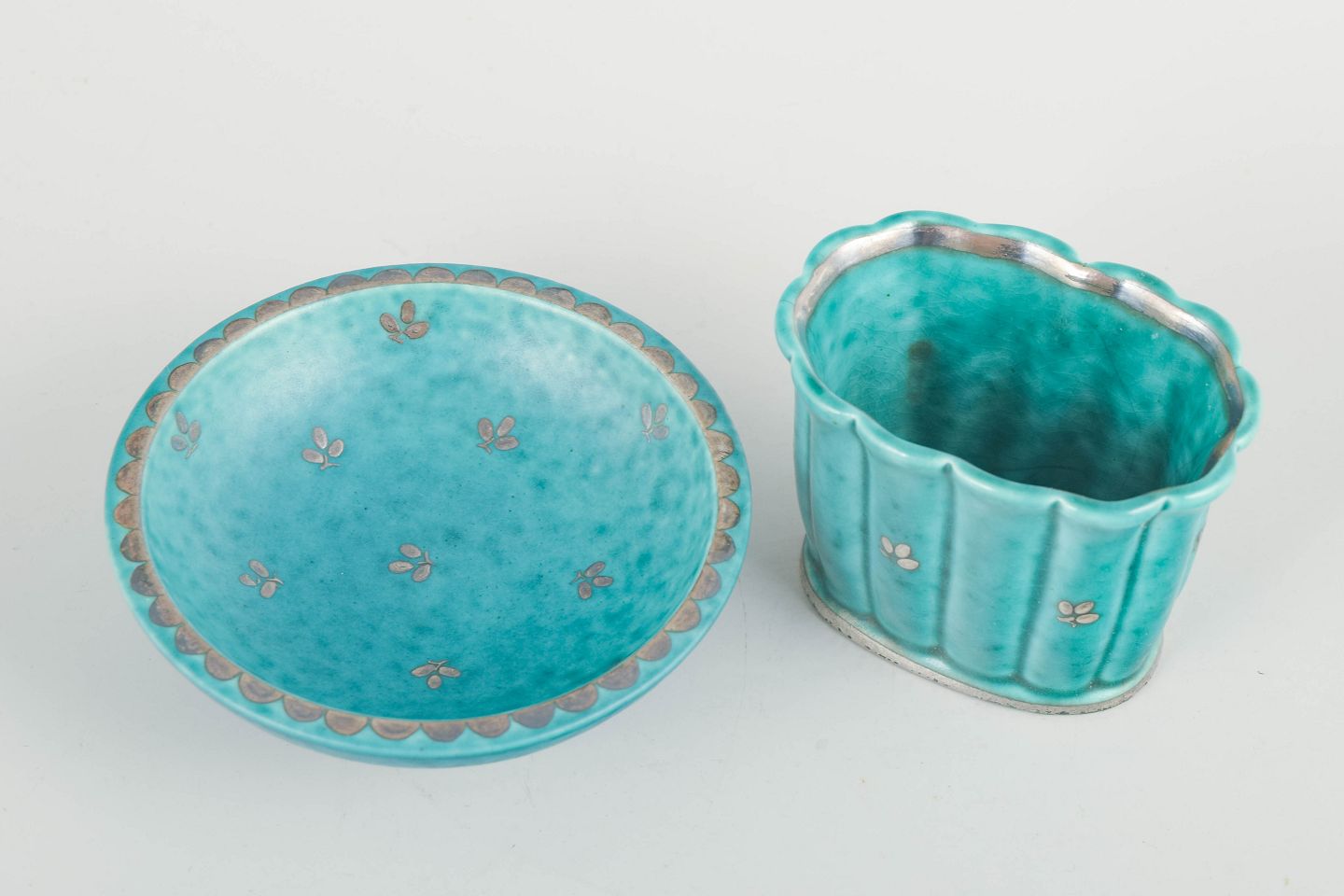 Skål og lille vase i klassisk turkis glasur med indlagte sølvdekorationer, karakteristisk for Kåges ikoniske Argenta-arbejder for Gustavsberg. Elegante, små formater med tydelig studiopræcision.
