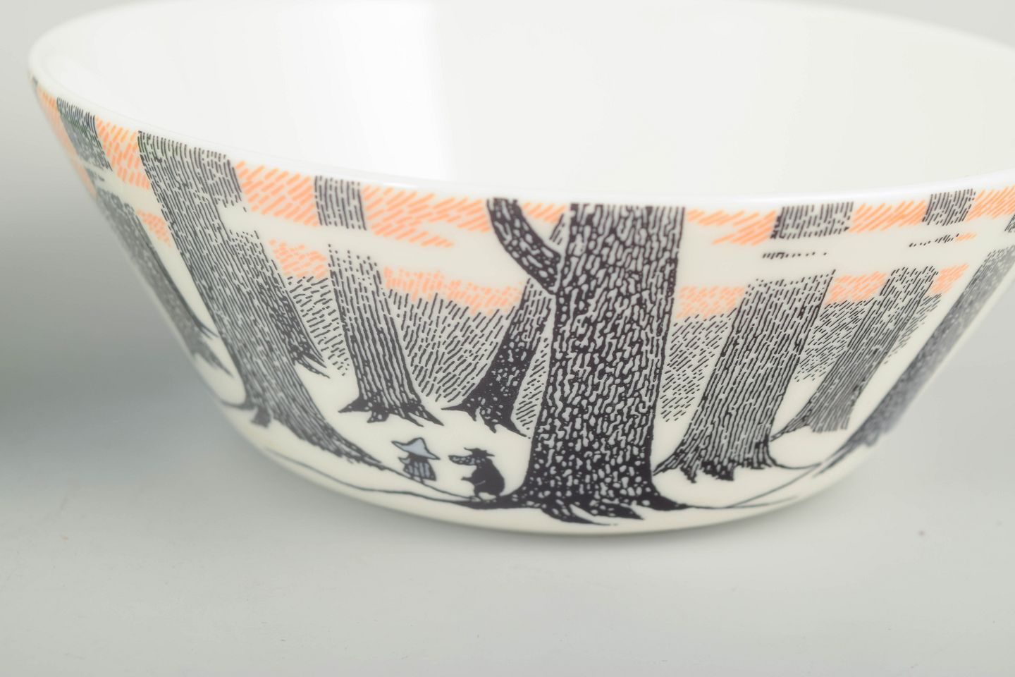 To dekorative Mumi-skåle i porcelæn fra Arabia Finland. Den ene skål i lysegrøn med Snusmumrikken og teltmotiv; den anden med et mere grafisk skovmotiv i sort, hvid og orange, baseret på Tove Janssons originale tegninger.