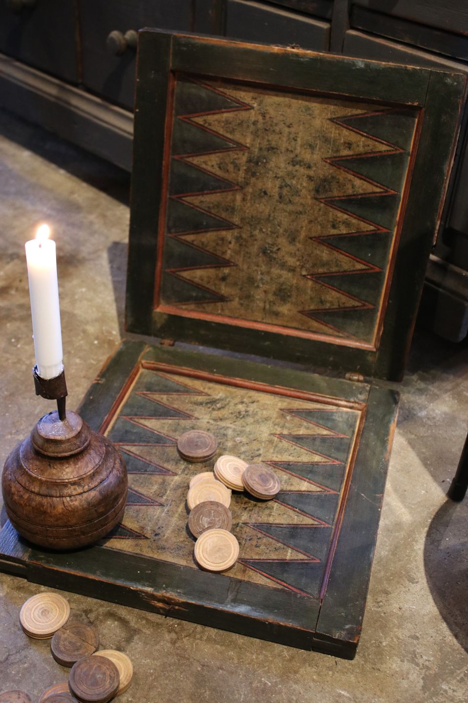 Charmerende antik 1800 tals spilleæske / brætspil i bemalet træ med 3 forskellige spil. Har en super fin patina.Æsken måler H: 6cm. 36x35cm. (inkl. 30 stk. spillebrikker)