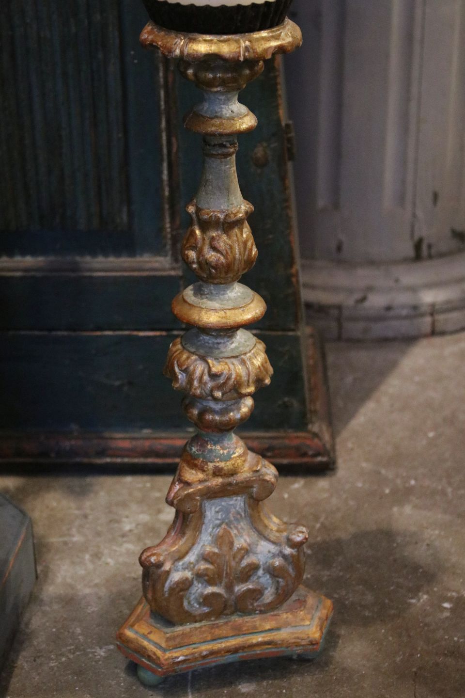 Antik , fransk 1800 tals lysestage i udskåret træmed original bemaling og med en rigtig fin patina.