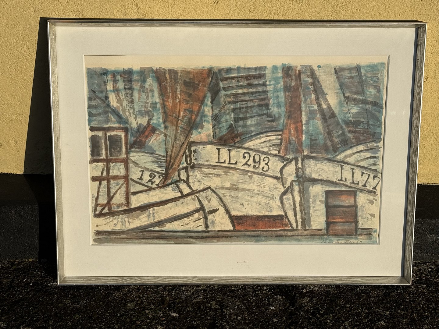 Anker Landberg, Litografi i ramme, Fiskebåde, signeret Anker Landberg 63, Mål med ramme: 79x58cm *Litografien er sunket lidt i passepartout rammen ellers fin stand*Lager: 1