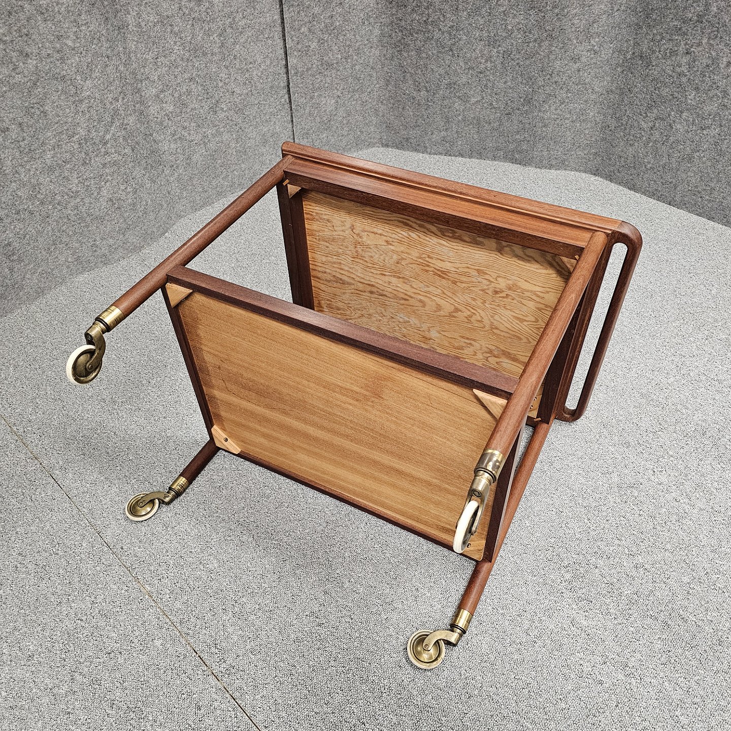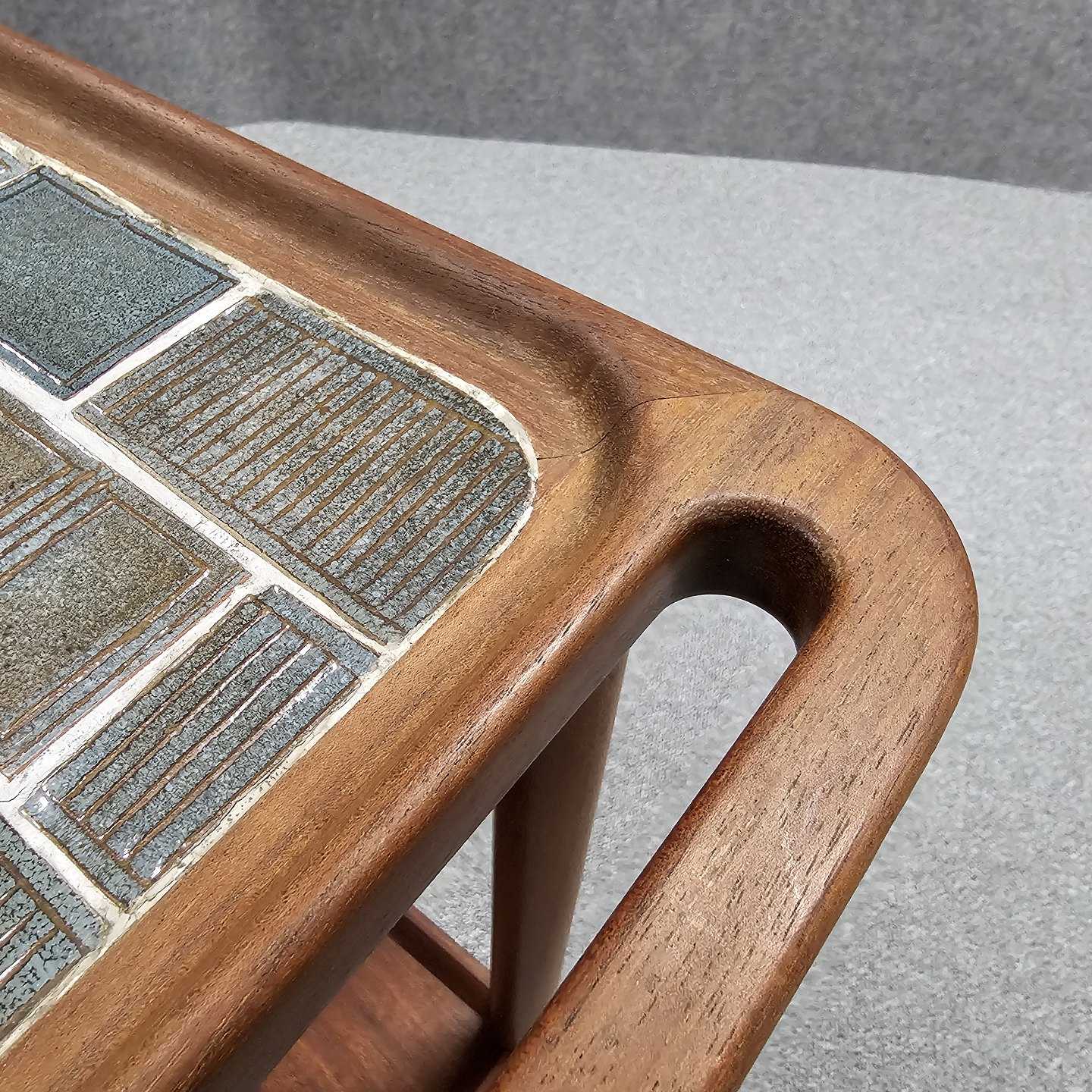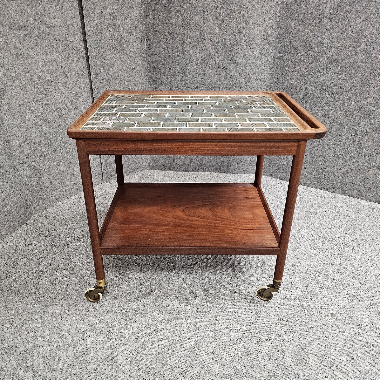 Rullebord i teak dekoreret med kakler i grønlige nuancerDer er brugsspor og slid ved hjulene, som virker fint